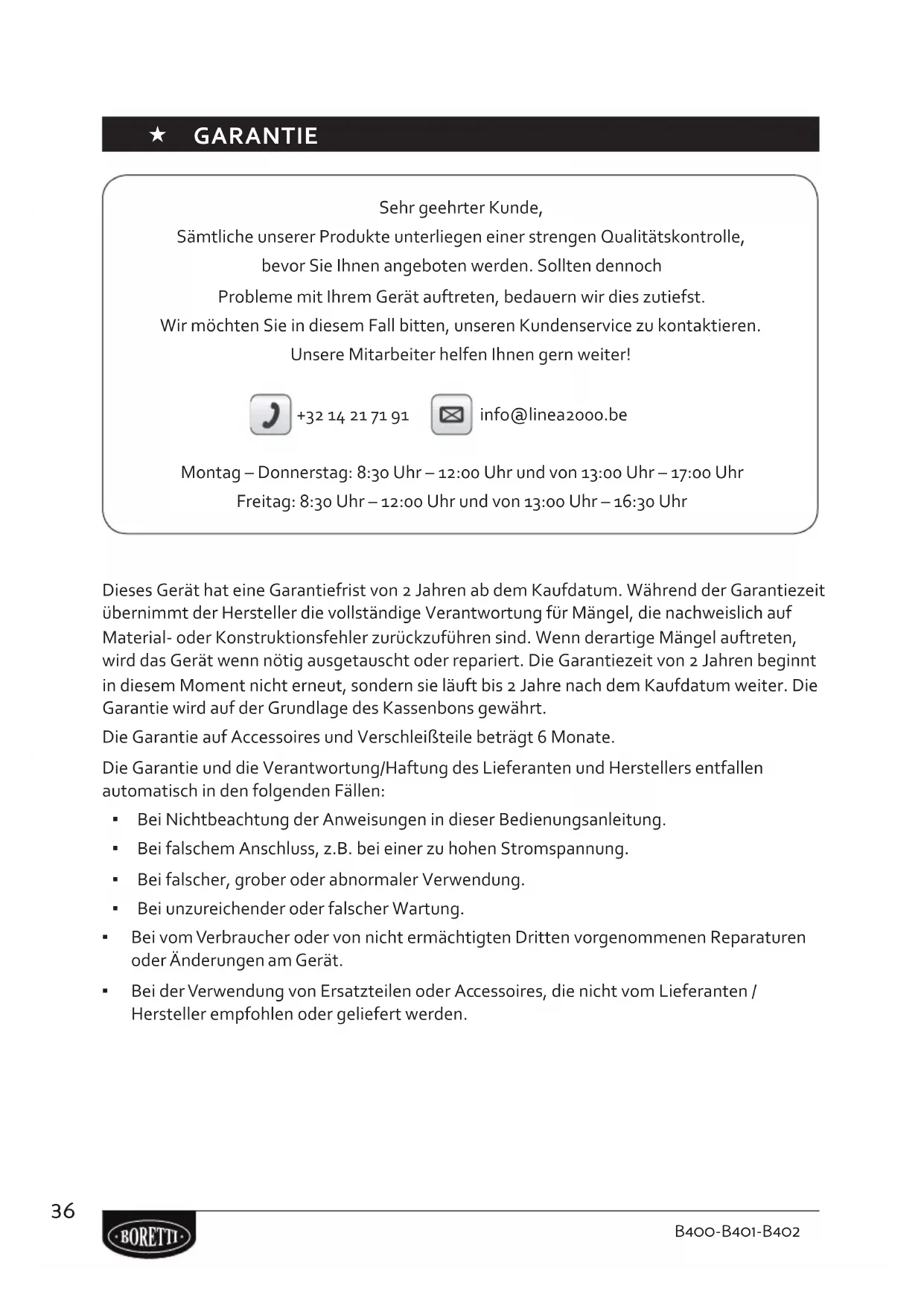 Ce symbole sur le produit ou son emballage indique que ce produit ne peut être traité comme déchet ménager. Il doit plutôt être remis au point de ramassage concerné, se chargeant du recyclage du matériel électrique et électronique. En vous assurant que ce produit est éliminé correctement, vous favorisez la prévention des conséquences négatives pour l’environnement et la santé humaine qui, sinon, seraient le résulat d’un traitement inapproprié des déchets de ce produit. Pour obtenir plus de détails sur le recyclage de ce produit, veuillez prendre contact avec le bureau municipal de votre région, votre service d’éliminiation des déchets ménagers ou le magasin où vous avez acheté le produit. L’emballage est recyclable. Traitez l’emballage écologiquement.36 B400-B401-B402 Bernini www.boretti.com Gebruiksaanwijzing NL Mode d’emploi FR De Dollard 17, 1454 AT Watergang T + 31 (0) 20 - 436 34 39, F +31 (0) 20 - 436 13 26 W www.boretti.com E info@boretti.com T +32 (0)3 450 81 80, F +32 (0)3 458 68 47W www.boretti.beE info@boretti.be Boretti - The Netherlands Boretti - Belgium www.boretti.com BORETTI0086 Cover Gebruiksaanwijzingen_v4.indd 3-4 06-11-15 16:33 « GARANTIE Sehr geehrter Kunde, Sämtliche unserer Produkte unterliegen einer strengen Qualitätskontrolle, bevor Sie Ihnen angeboten werden. Sollten dennoch Probleme mit Ihrem Gerät auftreten, bedauern wir dies zutiefst. Wir möchten Sie in diesem Fall bitten, unseren Kundenservice zu kontaktieren. Unsere Mitarbeiter helfen Ihnen gern weiter! +32 14 21 71 91 info@linea2000.be Montag – Donnerstag: 8:30 Uhr – 12:00 Uhr und von 13:00 Uhr – 17:00 Uhr Freitag: 8:30 Uhr – 12:00 Uhr und von 13:00 Uhr – 16:30 Uhr Dieses Gerät hat eine Garantiefrist von 2 Jahren ab dem Kaufdatum. Während der Garantiezeit übernimmt der Hersteller die vollständige Verantwortung für Mängel, die nachweislich auf Material- oder Konstruktionsfehler zurückzuführen sind. Wenn derartige Mängel auftreten, wird das Gerät wenn nötig ausgetauscht oder repariert. Die Garantiezeit von 2 Jahren beginnt in diesem Moment nicht erneut, sondern sie läuft bis 2 Jahre nach dem Kaufdatum weiter. Die Garantie wird auf der Grundlage des Kassenbons gewährt. Die Garantie auf Accessoires und Verschleißteile beträgt 6 Monate. Die Garantie und die Verantwortung/Haftung des Lieferanten und Herstellers entfallen automatisch in den folgenden Fällen: