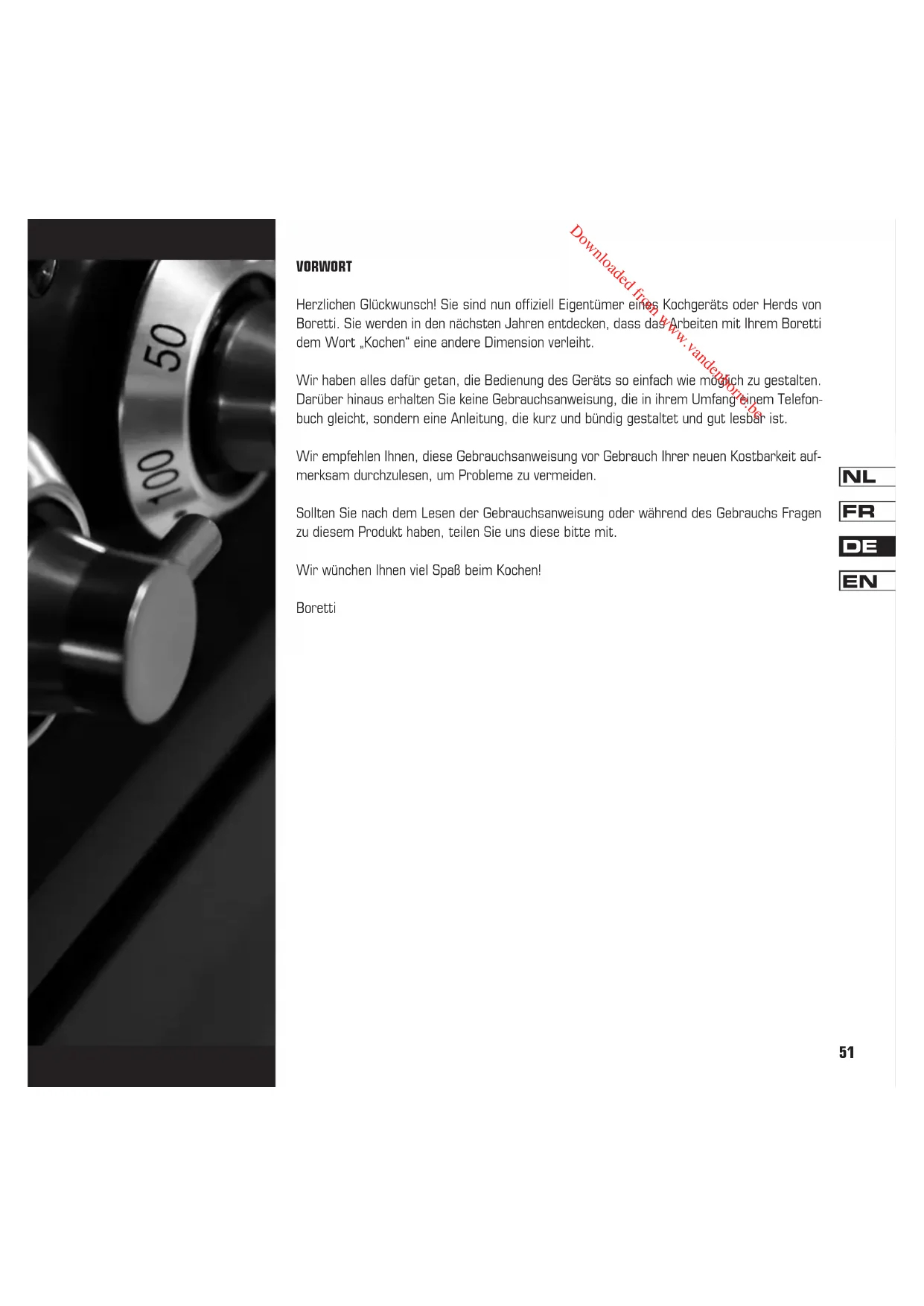VORWORT Herzlichen Glückwunsch! Sie sind nun offiziell Eigentümer eines Kochgeräts oder Herds von Boretti. Sie werden in den nächsten Jahren entdecken, dass das Arbeiten mit Ihrem Boretti dem Wort „Kochen“ eine andere Dimension verleiht. Wir haben alles dafür getan, die Bedienung des Geräts so einfach wie möglich zu gestalten. Darüber hinaus erhalten Sie keine Gebrauchsanweisung, die in ihrem Umfang einem Telefon- buch gleicht, sondern eine Anleitung, die kurz und bündig gestaltet und gut lesbar ist. Wir empfehlen Ihnen, diese Gebrauchsanweisung vor Gebrauch Ihrer neuen Kostbarkeit auf- merksam durchzulesen, um Probleme zu vermeiden. Sollten Sie nach dem Lesen der Gebrauchsanweisung oder während des Gebrauchs Fragen zu diesem Produkt haben, teilen Sie uns diese bitte mit. Wir wünchen Ihnen viel Spaß beim Kochen! Boretti Downloaded from www.vandenborre.be52 Index Vorwort Für den Installateur 53 – Allgemeine Informationen zur Montage – Elektrischer Anschluss – Gasanschluss Vor dem ersten Gebrauch 55 – Sicherheitsvorschriften – Umweltvorschriften – Reinigung vor dem ersten Gebrauch Funktionsweise der programmierbaren LCD-Uhr 57 – Das Einstellen der richtigen Zeit – Manuelle Funktion – Akustisches Signal einstellen – Die Eieruhr – Automatische Backfunktionen Funktionsweise der programmierbaren LCD-Uhr eines Gasofens 59 – Das Einstellen der richtigen Zeit – Einstellen der Eieruhr – Akustisches Signal einstellen Funktionsweise der programmierbaren analogen Uhr 60 – Das Einstellen der richtigen Zeit – Manuelle Funktion – Die Eieruhr mit automatischem Countdown – Automatische Backfunktionen Erklärung zur Benutzung des Ofens im Allgemeinen 61 – Beschreibung der diversen Ofenfunktionen – Die Quickstart-Funktion – Der Grill(-Ofen) – Die Verwendung des Drehspießes – Die Mantelkühlung – Das Demontieren der Ofentür – Das Demontieren der Glasscheibe – Das Entfernen des Ofeninneren – Das Reinigen des Ofenraums (der Ofenräume) – Die Verwendung des Kernthermometers – Pizzaplatte Erklärung zur Benutzung des Gasofens 65 – Das Zünden des Gasofens – Der Grill im Gasofen – Der Ventilator im Gasofen Die Kochfläche 67 – Die Gasbrenner im Allgemeinen – Der Wokbrenner – Der Fry-Top – Reinigen des Fry-Top – Der Coupe de Feu – Das Einstellen der Gasbrenner – Gusseiserne Grillplatte – Das Reinigen der Kochfläche – Die keramische Kochfläche – Die Induktionskochfläche Technische Details 71 – Tabelle für Kernthermometer – Probleme lösen – Anschlusspläne – Leistungen und Werte Downloaded from www.vandenborre.be53