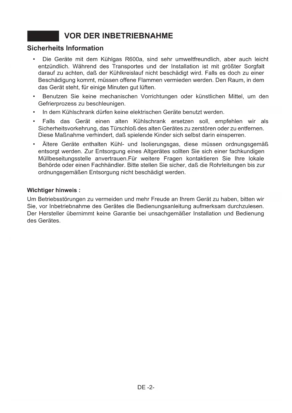 - Ältere Geräte enthalten Kühl- und Isolierungsgas, diese müssen ordnungsgemäß entsorgt werden. Zur Entsorgung eines Altgerätes sollten Sie sich einer fachkundigen Müllbeseitungsstelle anvertrauen.Für weitere Fragen kontaktieren Sie Ihre lokale Behörde oder einen Fachhändler. Bitte stellen Sie sicher, daß die Rohrleitungen bis zur ordnungsgemäßen Entsorgung nicht beschädigt werden. Wichtiger hinweis : Um Betriebsstörungen zu vermeiden und mehr Freude an Ihrem Gerät zu haben, bitten wir Sie, vor Inbetriebnahme des Gerätes die Bedienungsanleitung aufmerksam durchzulesen. Der Hersteller übernimmt keine Garantie bei unsachgemäßer Installation und Bedienung des Gerätes.DE -3- Empfehlungen ! Warnung: Benutzen sie keine mechanischen hilfsmittel oder andere mittel zur beschleunigung des abtauvorgangs. Setzen sie keinerlei elektrogeräte im inneren des gerätes ein. Halten sie die belüftungsöffnungen des gerätes frei. Beschädigen sie nicht den kühlkreislauf des gerätes.