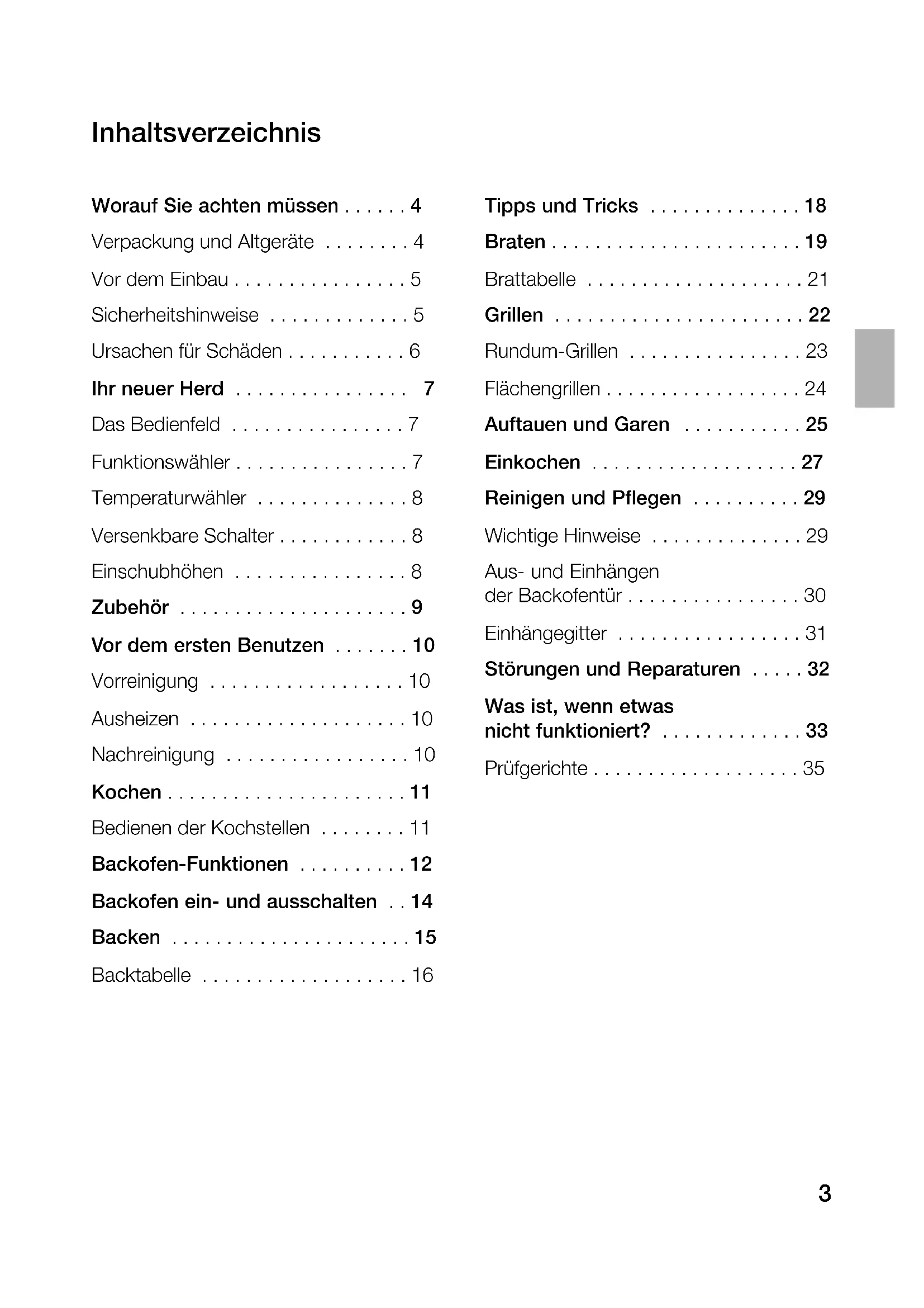 - Prüfgerichte Worauf Sie achten müssen Lesen Sie bitte sorgfältig diese Gebrauchsanleitung. Nur dann können Sie Ihren Herd sicher und richtig bedienen. Diese Gebrauchsanleitung gilt für mehrere Geräte- Ausführungen. Es ist möglich, dass einzelne Ausstattungsmerkmale beschrieben sind, die nicht auf Ihr Gerät zutreffen. Heben Sie die Gebrauchs- und die Montagean- leitung gut auf. Wenn Sie das Gerät weitergeben, legen Sie die Anleitung bei. Verpackung und Ihr neues Gerät wurde auf dem Weg zu Ihnen durch Altgerät die Verpackung geschützt. Alle eingesetzten Materialien sind umweltverträglich und wieder verwertbar. Bitte helfen Sie mit und entsorgen Sie die Verpackung umweltgerecht. Altgeräte sind kein wertloser Abfall. Durch umwelt- gerechte Entsorgung können wertvolle Rohstoffe wiedergewonnen werden. Bevor Sie das Altgerät entsorgen, machen Sie es unbrauchbar oder kennzeichnen Sie es mit einem Aufkleber „Achtung Schrott!” Dieses Gerät ist entsprechend der europäischen Richtlinie 2002/96/EG über Elektro- und Elektronik-Altgeräte (waste electrical and electronic equipment – WEEE) gekennzeichnet. Die Richtlinie gibt den Rahmen für eine EU-weit gültige Rücknahme und Verwertung der Altgeräte vor. Über aktuelle Entsorgungswege informieren Sie sich bitte bei Ihrem Fachhändler oder bei Ihrer Gemeinde- verwaltung.5 Vor dem Einbau Transportschäden Prüfen Sie das Gerät nach dem Auspacken. Bei einem Transportschaden dürfen Sie das Gerät nicht anschließen. Elektrischer Anschluss Nur ein konzessionierter Fachmann darf das Gerät anschließen. Bei Schäden durch falschen Anschluss haben Sie keinen Anspruch auf Garantie. Sicherheitshinweise Dieses Gerät ist nur für den privaten Haushalt bestimmt. Benutzen Sie den Herd ausschließlich zum Zubereiten von Speisen. Heißer Backofen Die Backofentür vorsichtig öffnen. Es kann heißer Dampf austreten. Nie die heißen Backofen-Innenflächen und die Heizelemente berühren. Verbrennungsgefahr! Halten Sie Kinder grundsätzlich fern. Nie brennbare Gegenstände im Backofen aufbewahren. Nie brennbare Gegenstände auf das Kochfeld legen. Brandgefahr! Nie Anschlusskabel von Elektrogeräten auf die heißen Kochstellen legen. Nie Anschlusskabel von Elektrogeräten in der heißen Backofentür einklemmen. Die Kabelisolierung kann schmelzen. Kurzschluss-Gefahr! Entfernen Sie Rückstände der Verpackung z. B. Styroporteilchen vollständig aus dem Backofen. Reparaturen Unsachgemäße Reparaturen sind gefährlich. Stromschlag-Gefahr! Nur ein von uns geschulter Kundendienst-Techniker darf Reparaturen durchführen. Wenn das Gerät defekt ist, die Sicherung im Sicherungskasten ausschalten. Rufen Sie den Kundendienst.6 Ursachen für Schäden Backbleche, Alufolie oder Schieben Sie auf dem Backofenboden kein Geschirr auf dem Backblech ein. Legen Sie ihn nicht mit Alufolie aus. Backofenboden Stellen Sie kein Geschirr auf den Backofenboden. Es entsteht ein Wärmestau. Die Back- und Bratzeiten stimmen nicht mehr und das Email wird beschädigt. Einschubteile Einschubteile vorsichtig einschieben um Beschädigungen zu vermeiden. Backpapier Legen Sie Backpapier beim Arbeiten mit Heißluft p. 354