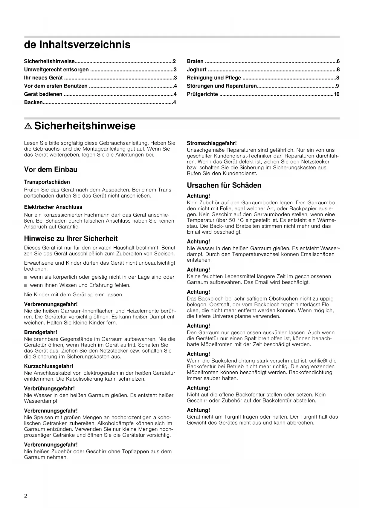 - Prüfgerichte m Sicherheitshinweise Lesen Sie bitte sorgfältig diese Gebrauchsanleitung. Heben Sie die Gebrauchs- und die Montageanleitung gut auf. Wenn Sie das Gerät weitergeben, legen Sie die Anleitungen bei. Vor dem Einbau Transportschäden Prüfen Sie das Gerät nach dem Auspacken. Bei einem Trans- portschaden dürfen Sie das Gerät nicht anschließen. Elektrischer Anschluss Nur ein konzessionierter Fachmann darf das Gerät anschlie- ßen. Bei Schäden durch falschen Anschluss haben Sie keinen Anspruch auf Garantie. Hinweise zu Ihrer Sicherheit Dieses Gerät ist nur für den privaten Haushalt bestimmt. Benut- zen Sie das Gerät ausschließlich zum Zubereiten von Speisen. Erwachsene und Kinder dürfen das Gerät nicht unbeaufsichtigt bedienen, ■ wenn sie körperlich oder geistig nicht in der Lage sind oder ■ wenn ihnen Wissen und Erfahrung fehlen. Nie Kinder mit dem Gerät spielen lassen. Verbrennungsgefahr! Nie die heißen Garraum-Innenflächen und Heizelemente berüh- ren. Die Gerätetür vorsichtig öffnen. Es kann heißer Dampf ent- weichen. Halten Sie kleine Kinder fern. Brandgefahr! Nie brennbare Gegenstände im Garraum aufbewahren. Nie die Gerätetür öffnen, wenn Rauch im Gerät auftritt. Schalten Sie das Gerät aus. Ziehen Sie den Netzstecker bzw. schalten Sie die Sicherung im Sicherungskasten aus. Kurzschlussgefahr! Nie Anschlusskabel von Elektrogeräten in der heißen Gerätetür einklemmen. Die Kabelisolierung kann schmelzen. Verbrühungsgefahr! Nie Wasser in den heißen Garraum gießen. Es entsteht heißer Wasserdampf. Verbrennungsgefahr! Nie Speisen mit großen Mengen an hochprozentigen alkoho- lischen Getränken zubereiten. Alkoholdämpfe können sich im Garraum entzünden. Verwenden Sie nur kleine Mengen hoch- prozentiger Getränke und öffnen Sie die Gerätetür vorsichtig. Verbrennungsgefahr! Nie heißes Zubehör oder Geschirr ohne Topflappen aus dem Garraum nehmen. Stromschlaggefahr! Unsachgemäße Reparaturen sind gefährlich. Nur ein von uns geschulter Kundendienst-Techniker darf Reparaturen durchfüh- ren. Wenn das Gerät defekt ist, ziehen Sie den Netzstecker bzw. schalten Sie die Sicherung im Sicherungskasten aus. Rufen Sie den Kundendienst. Ursachen für Schäden Achtung! Kein Zubehör auf den Garraumboden legen. Den Garraumbo- den nicht mit Folie, egal welcher Art, oder Backpapier ausle- gen. Kein Geschirr auf den Garraumboden stellen, wenn eine Temperatur über 50 °C eingestellt ist. Es entsteht ein Wärme- stau. Die Back- und Bratzeiten stimmen nicht mehr und das Email wird beschädigt. Achtung! Nie Wasser in den heißen Garraum gießen. Es entsteht Wasser- dampf. Durch den Temperaturwechsel können Emailschäden entstehen. Achtung! Keine feuchten Lebensmittel längere Zeit im geschlossenen Garraum aufbewahren. Das Email wird beschädigt. Achtung! Das Backblech bei sehr saftigem Obstkuchen nicht zu üppig belegen. Obstsaft, der vom Backblech tropft hinterlässt Fle- cken, die nicht mehr entfernt werden können. Wenn möglich, die tiefere Universalpfanne verwenden. Achtung! Den Garraum nur geschlossen auskühlen lassen. Auch wenn die Gerätetür nur einen Spalt breit offen ist, können benach- barte Möbelfronten mit der Zeit beschädigt werden. Achtung! Wenn die Backofendichtung stark verschmutzt ist, schließt die Backofentür bei Betrieb nicht mehr richtig. Die angrenzenden Möbelfronten können beschädigt werden. Backofendichtung immer sauber halten. Achtung! Nicht auf die offene Backofentür stellen oder setzen. Kein Geschirr oder Zubehör auf der Backofentür abstellen. Achtung! Gerät nicht am Türgriff tragen oder halten. Der Türgriff hält das Gewicht des Gerätes nicht aus und kann abbrechen.3 Umweltgerecht entsorgen Entsorgen Sie die Verpackung umweltgerecht. Die Richtlinie gibt den Rahmen für eine EU-weit gültige Rück- nahme und Verwertung der Altgeräte vor. Ihr neues Gerät In diesem Kapitel erhalten Sie Informationen über das Gerät, die Betriebsarten und das Zubehör. Bedienfeld Betriebsarten Einschubhöhen Der Garraum hat vier Einschubhöhen. Die Einschubhöhen wer- den von unten nach oben gezählt. Zubehör Ihrem Gerät liegt folgendes Zubehör bei: Weiteres Zubehör erhalten Sie im Fachhandel: Backblech und Universalpfanne können sich durch große Tem- peraturunterschiede (z. B. bei Tiefgekühltem im heißen Gar- raum) verziehen. Dieses Gerät ist entsprechend der europäischen Richtli- nie 2002/96/EG über Elektro- und Elektronik-Altgeräte (wate electrical and electronic equipment - WEEE) gekennzeichet. Bedienelement Verwendung Betriebsarten- und Temperaturwähler Betriebsart und Temperatur wählen Bedienknebel für Kochstellen Anzeigelampe ï leuchtet nicht: Kochstellen aus Anzeigelampe ï leuchtet: Mindestens eine Kochstelle ist an Betriebsarten Anwendung Ober-/Unterhitze 50 - 270 °C zum Backen und Braten. Besonders geeignet für Kuchen mit feuchtem Belag (z. B. Käsekuchen) # Oberhitze für Speisen und Backwaren, die an der Oberseite eine stärkere Bräunung oder Kruste erhalten sollen. Schalten Sie die Oberhitze am Ende der Backzeit nur kurz zu $ Unterhitze für Speisen und Backwaren, die an der Unterseite eine stärkere Bräunung oder Kruste erhalten sollen. Schalten Sie die Unterhitze am Ende der Backzeit nur kurz zu \ Backofenbeleuchtung unterstützt bei Pflege und Reinigung des Garraums Bedienknebel für Kochstellen Betriebsarten- und Temperaturwähler Backblech, Aluminium zum Backen von Blechkuchen und Kleingebäck Rost, flach zum Backen in Formen, zum Braten in Bratgeschirr und zum Grillen Zubehör Bestellnr. Backblech, Aluminium CZ 1332 X0 Backblech, emailiert CZ 1342 X0 Universalpfanne, emailiert CZ 1242 X0 Rost, flach CZ 1442 X0 Rost, gekröpft mit Schöpfloch CZ 1432 X0 System-Dampfgarer CZ 1282 X0 Nachrüstsatz CLOU 2-fach CZ 1702 X0 Nachrüstsatz CLOU 3-fach CZ 1742 X0 Nachrüstsatz CLOU 4-fach CZ 1752 X0 Schutzvorrichtung für Backofentür 4406514 Vor dem ersten Benutzen Reinigen Sie Ihr Gerät vor dem 