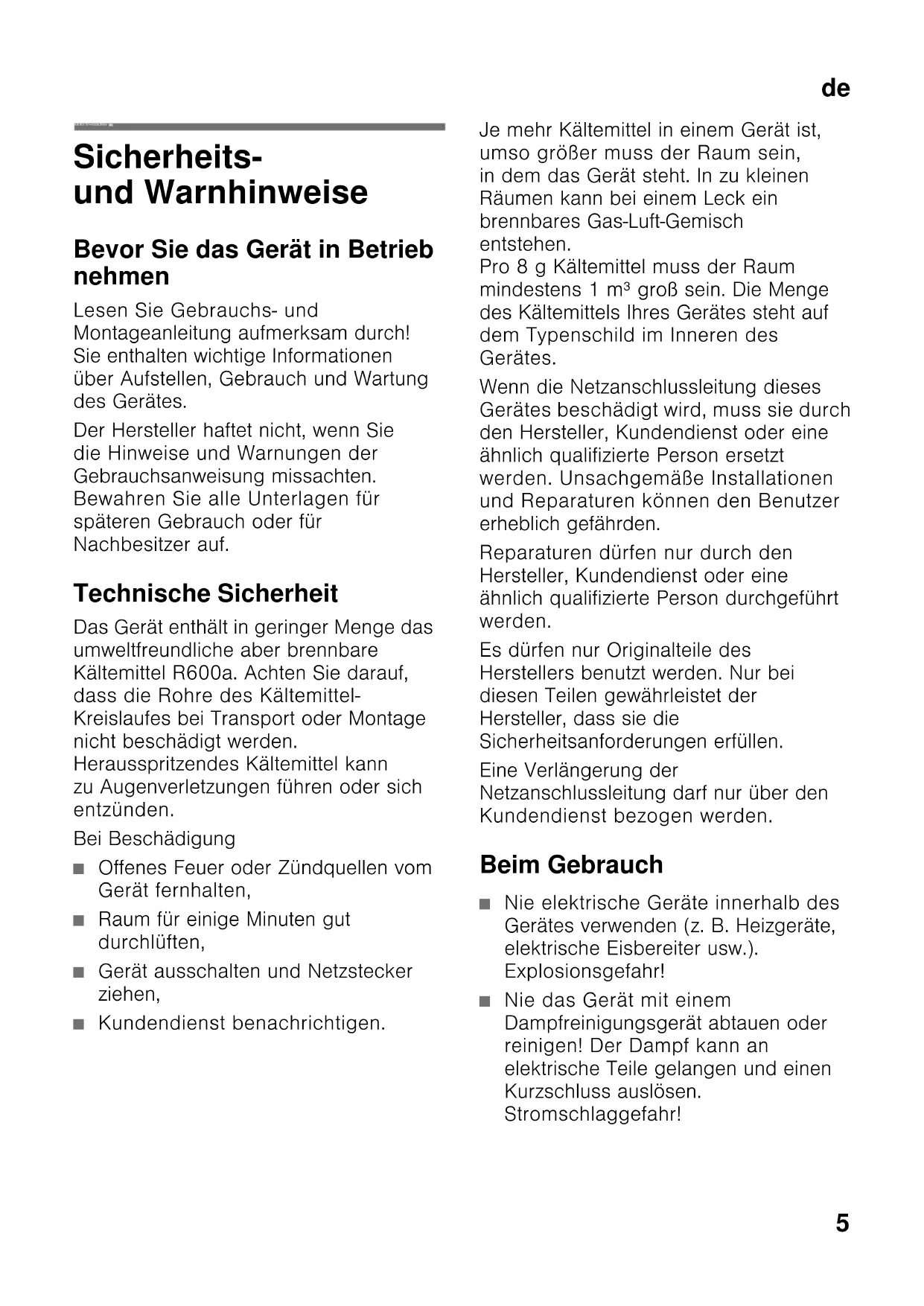 deInha ltsverzeichnis deGebrauchsanleitung Sicherheits- und Warnhinweise Bevor Sie das Gerät in Betrieb nehmen Lesen Sie Gebrauchs- und Montageanleitung aufmerksam durch! Sie enthalten wichtige Informationen über Aufstellen, Gebrauch und Wartung des Gerätes. Der Hersteller haftet nicht, wenn Sie die Hinweise und Warnungen der Gebrauchsanweisung missachten. Bewahren Sie alle Unterlagen für späteren Gebrauch oder für Nachbesitzer auf. Technische Sicherheit Das Gerät enthält in geringer Menge das umweltfreundliche aber brennbare Kältemittel R600a. Achten Sie darauf, dass die Rohre des Kältemittel- Kreislaufes bei Transport oder Montage nicht beschädigt werden. Herausspritzendes Kältemittel kann zu Augenverletzungen führen oder sich entzünden. Bei Beschädigung ■ Offenes Feuer oder Zündquellen vom Gerät fernhalten, ■ Raum für einige Minuten gut durchlüften, ■ Gerät ausschalten und Netzstecker ziehen, ■ Kundendienst benachrichtigen. Je mehr Kältemittel in einem Gerät ist, umso größer muss der Raum sein, in dem das Gerät steht. In zu kleinen Räumen kann bei einem Leck ein brennbares Gas-Luft-Gemisch entstehen. Pro 8 g Kältemittel muss der Raum mindestens 1 m³ groß sein. Die Menge des Kältemittels Ihres Gerätes steht auf dem Typenschild im Inneren des Gerätes. Wenn die Netzanschlussleitung dieses Gerätes beschädigt wird, muss sie durch den Hersteller, Kundendienst oder eine ähnlich qualifizierte Person ersetzt werden. Unsachgemäße Installationen und Reparaturen können den Benutzer erheblich gefährden. Reparaturen dürfen nur durch den Hersteller, Kundendienst oder eine ähnlich qualifizierte Person durchgeführt werden. Es dürfen nur Originalteile des Herstellers benutzt werden. Nur bei diesen Teilen gewährleistet der Hersteller, dass sie die Sicherheitsanforderungen erfüllen. Eine Verlängerung der Netzanschlussleitung darf nur über den Kundendienst bezogen werden. Beim Gebrauch ■ Nie elektrische Geräte innerhalb des Gerätes verwenden (z. B. Heizgeräte, elektrische Eisbereiter usw.). Explosionsgefahr! ■ Nie das Gerät mit einem Dampfreinigungsgerät abtauen oder reinigen! Der Dampf kann an elektrische Teile gelangen und einen Kurzschluss auslösen. Stromschlaggefahr!de