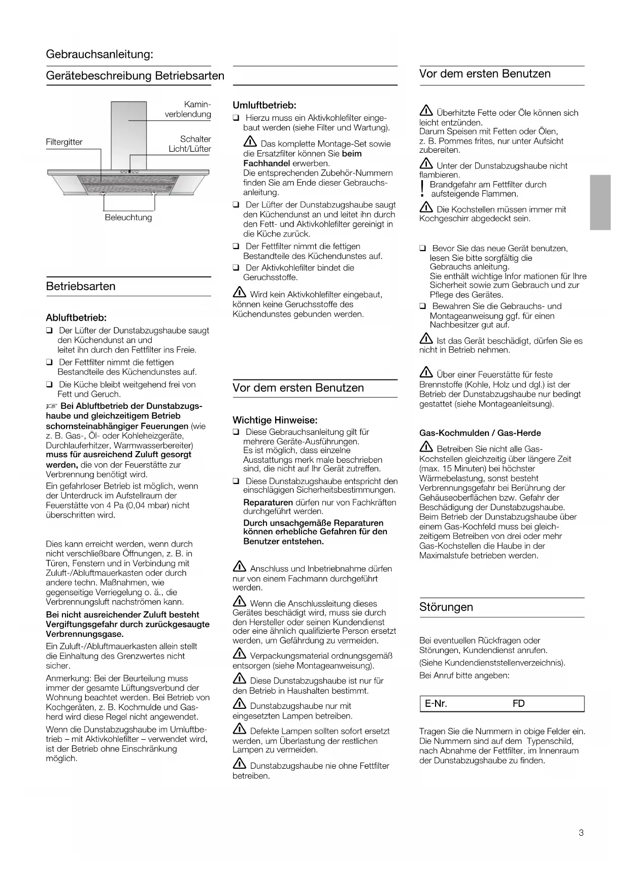Gerätebeschreibung Betriebsarten Betriebsarten Abluftbetrieb:q Der Lüfter der Dunstabzugshaube saugtden Küchendunst an und leitet ihn durch den Fettfilter ins Freie.q Der Fettfilter nimmt die fettigen Bestandteile des Küchendunstes auf.q Die Küche bleibt weitgehend frei vonFett und Geruch. Bei Abluftbetrieb der Dunstabzugs-haube und gleichzeitigem Betriebschornsteinabhängiger Feuerungen (wiez. B. Gas-, Öl- oder Kohleheizgeräte,Durchlauferhitzer, Warmwasserbereiter)muss für ausreichend Zuluft gesorgt werden, die von der Feuerstätte zur Verbrennung benötigt wird.Ein gefahrloser Betrieb ist möglich, wennder Unterdruck im Aufstellraum der Feuerstätte von 4 Pa (0,04 mbar) nichtüberschritten wird.Dies kann erreicht werden, wenn durchnicht verschließbare Öffnungen, z. B. inTüren, Fenstern und in Verbindung mitZuluft-/Abluftmauerkasten oder durchandere techn. Maßnahmen, wie gegenseitige Verriegelung o. ä., dieVerbrennungsluft nachströmen kann.Bei nicht ausreichender Zuluft bestehtVergiftungsgefahr durch zurückgesaugteVerbrennungsgase.Ein Zuluft-/Abluftmauerkasten allein stelltdie Einhaltung des Grenzwertes nichtsicher.Anmerkung: Bei der Beurteilung mussimmer der gesamte Lüftungsverbund derWohnung beachtet werden. Bei Betrieb vonKochgeräten, z. B. Kochmulde und Gas-herd wird diese Regel nicht angewendet.Wenn die Dunstabzugshaube im Umluftbe-trieb – mit Aktivkohlefilter – verwendet wird,ist der Betrieb ohne Einschränkung möglich. Gebrauchsanleitung: BeleuchtungFiltergitterKamin-verblendungSchalterLicht/LüfterUmluftbetrieb:q Hierzu muss ein Aktivkohlefilter einge-baut werden (siehe Filter und Wartung). 몇 Das komplette Montage-Set sowie die Ersatzfilter können Sie beimFachhandel erwerben.Die entsprechenden Zubehör-Nummernfinden Sie am Ende dieser Gebrauchs-anleitung.q Der Lüfter der Dunstabzugshaube saugtden Küchendunst an und leitet ihn durchden Fett- und Aktivkohlefilter gereinigt indie Küche zurück.q Der Fettfilter nimmt die fettigen Bestandteile des Küchendunstes auf.q Der Aktivkohlefilter bindet dieGeruchsstoffe. 몇 Wird kein Aktivkohlefilter eingebaut, können keine Geruchsstoffe des Küchendunstes gebunden werden. Störungen Bei eventuellen Rückfragen oder Störungen, Kundendienst anrufen. (Siehe Kundendienststellenverzeichnis).Bei Anruf bitte angeben: E-Nr. FD Tragen Sie die Nummern in obige Felder ein.Die Nummern sind auf dem Typenschild,nach Abnahme der Fettfilter, im Innenraumder Dunstabzugshaube zu finden. Vor dem ersten Benutzen Vor dem ersten Benutzen Wichtige Hinweise:q Diese Gebrauchsanleitung gilt für mehrere Geräte-Ausführungen. Es ist möglich, dass einzelneAusstattungs merk male beschriebensind, die nicht auf Ihr Gerät zutreffen.q Diese Dunstabzugshaube entspricht deneinschlägigen Sicherheitsbestimmungen.Reparaturen dürfen nur von Fachkräftendurchgeführt werden.Durch unsachgemäße Reparaturen können erhebliche Gefahren für denBenutzer entstehen. 몇 Über einer Feuerstätte für feste Brennstoffe (Kohle, Holz und dgl.) ist derBetrieb der Dunstabzugshaube nur bedingtgestattet (siehe Montageanleitsung).Gas-Kochmulden / Gas-Herde 몇 Betreiben Sie nicht alle Gas- Kochstellen gleichzeitig über längere Zeit(max. 15 Minuten) bei höchster Wärmebelastung, sonst besteht Verbrennungsgefahr bei Berührung derGehäuseoberflächen bzw. Gefahr derBeschädigung der Dunstabzugshaube.Beim Betrieb der Dunstabzugshaube übereinem Gas-Kochfeld muss bei gleich-zeitigem Betreiben von drei oder mehr Gas-Kochstellen die Haube in der Maximalstufe betrieben werden.q Bevor Sie das neue Gerät benutzen,lesen Sie bitte sorgfältig die Gebrauchs anleitung. Sie enthält wichtige Infor mationen für IhreSicherheit sowie zum Gebrauch und zurPflege des Gerätes.q Bewahren Sie die Gebrauchs- und Montageanweisung ggf. für einen Nachbesitzer gut auf. 몇 Ist das Gerät beschädigt, dürfen Sie es nicht in Betrieb nehmen. 몇 Anschluss und Inbetriebnahme dürfen nur von einem Fachmann durchgeführt werden. 몇 Wenn die Anschlussleitung dieses Gerätes beschädigt wird, muss sie durchden Hersteller oder seinen Kundendienstoder eine ähnlich qualifizierte Person ersetztwerden, um Gefährdung zu vermeiden. 몇 Verpackungsmaterial ordnungsgemäß entsorgen (siehe Montageanweisung). 몇 Diese Dunstabzugshaube ist nur für den Betrieb in Haushalten bestimmt. 몇 Dunstabzugshaube nur mit eingesetzten Lampen betreiben. 몇 Defekte Lampen sollten sofort ersetzt werden, um Überlastung der restlichenLampen zu vermeiden. 몇 Dunstabzugshaube nie ohne Fettfilter betreiben. 몇 Überhitzte Fette oder Öle können sich leicht entzünden.Darum Speisen mit Fetten oder Ölen, z. B. Pommes frites, nur unter Aufsichtzubereiten. 몇 Unter der Dunstabzugshaube nicht flambieren.Brandgefahr am Fettfilter durch ! aufsteigende Flammen. 몇 Die Kochstellen müssen immer mit Kochgeschirr abgedeckt sein.4 Bedienen der Dunstabzugshau