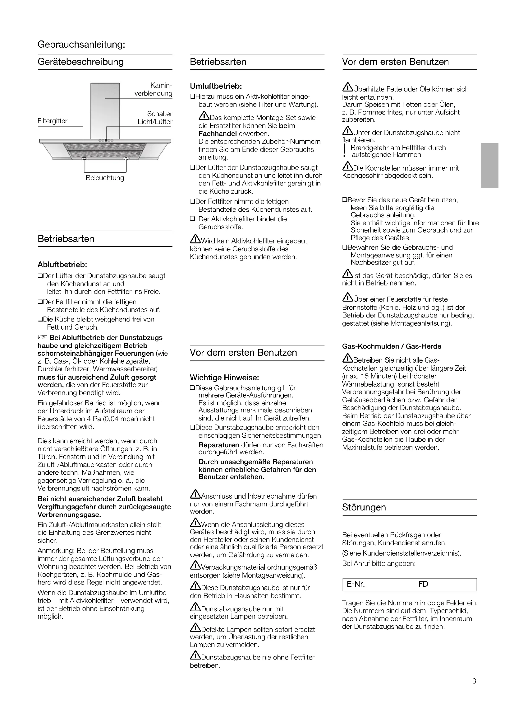 etriebsarten Betriebsarten Abluftbetrieb:q Der Lüfter der Dunstabzugshaube saugtden Küchendunst an und leitet ihn durch den Fettfilter ins Freie.q Der Fettfilter nimmt die fettigen Bestandteile des Küchendunstes auf.q Die Küche bleibt weitgehend frei vonFett und Geruch. Bei Abluftbetrieb der Dunstabzugs-haube und gleichzeitigem Betriebschornsteinabhängiger Feuerungen (wiez. B. Gas-, Öl- oder Kohleheizgeräte,Durchlauferhitzer, Warmwasserbereiter)muss für ausreichend Zuluft gesorgt werden, die von der Feuerstätte zur Verbrennung benötigt wird.Ein gefahrloser Betrieb ist möglich, wennder Unterdruck im Aufstellraum der Feuerstätte von 4 Pa (0,04 mbar) nichtüberschritten wird.Dies kann erreicht werden, wenn durchnicht verschließbare Öffnungen, z. B. inTüren, Fenstern und in Verbindung mitZuluft-/Abluftmauerkasten oder durchandere techn. Maßnahmen, wie gegenseitige Verriegelung o. ä., dieVerbrennungsluft nachströmen kann.Bei nicht ausreichender Zuluft bestehtVergiftungsgefahr durch zurückgesaugteVerbrennungsgase.Ein Zuluft-/Abluftmauerkasten allein stelltdie Einhaltung des Grenzwertes nichtsicher.Anmerkung: Bei der Beurteilung mussimmer der gesamte Lüftungsverbund derWohnung beachtet werden. Bei Betrieb vonKochgeräten, z. B. Kochmulde und Gas-herd wird diese Regel nicht angewendet.Wenn die Dunstabzugshaube im Umluftbe-trieb – mit Aktivkohlefilter – verwendet wird,ist der Betrieb ohne Einschränkung möglich. Gebrauchsanleitung: BeleuchtungFiltergitterKamin-verblendungSchalterLicht/LüfterUmluftbetrieb:q Hierzu muss ein Aktivkohlefilter einge-baut werden (siehe Filter und Wartung). 몇 Das komplette Montage-Set sowie die Ersatzfilter können Sie beimFachhandel erwerben.Die entsprechenden Zubehör-Nummernfinden Sie am Ende dieser Gebrauchs- nleitung.q Der Lüfter der Dunstabzugshaube saugtden Küchendunst an und leitet ihn durchden Fett- und Aktivkohlefilter gereinigt in ie Küche zurück.q Der Fettfilter nimmt die fettigen Bestandteile des Küchendunstes auf. Der Aktivkohlefilter bindet dieGeruchsstoffe. 몇 Wird kein Aktivkohlefilter eingebaut, können keine Geruchsstoffe des Küchendunstes gebunden werden. Störungen Bei eventuellen Rückfragen oder Störungen, Kundendienst anrufen. (Siehe Kundendienststellenverzeichnis).Bei Anruf bitte angeben: E-Nr. FD Tragen Sie die Nummern in obige Felder ein.Die Nummern sind auf dem Typenschild,nach Abnahme der Fettfilter, im Innenraumder Dunstabzugshaube zu finden. Vor dem ersten Benutzen