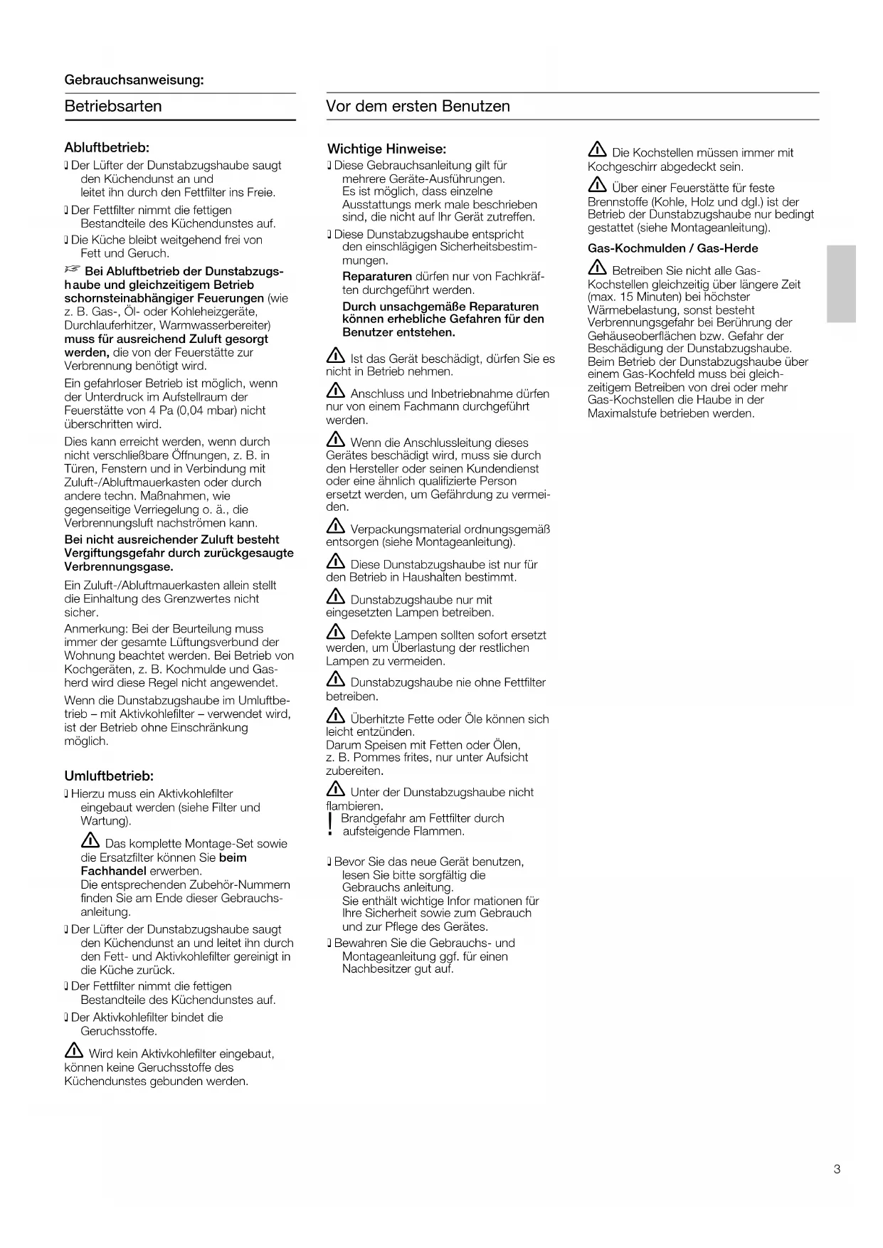 sv2 de Seite 3 – 10 nl pagina 11 – 18 fr page 19 – 26 it pagina 27 – 34 en page 35 – 42 es página 43 – 50 sv sid 51 – 583q Bevor Sie das neue Gerät benutzen,lesen Sie bitte sorgfältig die Gebrauchs anleitung. Sie enthält wichtige Infor mationen fürIhre Sicherheit sowie zum Gebrauchund zur Pflege des Gerätes.q Bewahren Sie die Gebrauchs- und Montageanleitung ggf. für einen Nachbesitzer gut auf. Wichtige Hinweise: q Diese Gebrauchsanleitung gilt für mehrere Geräte-Ausführungen. Es ist möglich, dass einzelneAusstattungs merk male beschriebensind, die nicht auf Ihr Gerät zutreffen.q Diese Dunstabzugshaube entsprichtden einschlägigen Sicherheitsbestim-mungen.Reparaturen dürfen nur von Fachkräf-ten durchgeführt werden.Durch unsachgemäße Reparaturen können erhebliche Gefahren für denBenutzer entstehen. Vor dem ersten Benutzen Ist das Gerät beschädigt, dürfen Sie es nicht in Betrieb nehmen. Anschluss und Inbetriebnahme dürfen nur von einem Fachmann durchgeführt werden. Wenn die Anschlussleitung dieses Gerätes beschädigt wird, muss sie durchden Hersteller oder seinen Kundendienstoder eine ähnlich qualifizierte Personersetzt werden, um Gefährdung zu vermei- den. Verpackungsmaterial ordnungsgemäß entsorgen (siehe Montageanleitung). Diese Dunstabzugshaube ist nur für den Betrieb in Haushalten bestimmt. Dunstabzugshaube nur mit eingesetzten Lampen betreiben. Defekte Lampen sollten sofort ersetzt werden, um Überlastung der restlichenLampen zu vermeiden. Dunstabzugshaube nie ohne Fettfilter betreiben. Überhitzte Fette oder Öle können sich leicht entzünden.Darum Speisen mit Fetten oder Ölen, z. B. Pommes frites, nur unter Aufsichtzubereiten. Unter der Dunstabzugshaube nicht flambieren.Brandgefahr am Fettfilter durch ! aufsteigende Flammen. Die Kochstellen müssen immer mit Kochgeschirr abgedeckt sein. Über einer Feuerstätte für feste Brennstoffe (Kohle, Holz und dgl.) ist derBetrieb der Dunstabzugshaube nur bedingtgestattet (siehe Montageanleitung).Gas-Kochmulden / Gas-Herde Betreiben Sie nicht alle Gas- Kochstellen gleichzeitig über längere Zeit(max. 15 Minuten) bei höchster Wärmebelastung, sonst besteht Verbrennungsgefahr bei Berührung derGehäuseoberflächen bzw. Gefahr derBeschädigung der Dunstabzugshaube.Beim Betrieb der Dunstabzugshaube übereinem Gas-Kochfeld muss bei gleich-zeitigem Betreiben von drei oder mehr Gas-Kochstellen die Haube in der Maximalstufe betrieben werden. Abluftbetrieb: q Der Lüfter der Dunstabzugshaube saugtden Küchendunst an und leitet ihn durch den Fettfilter ins Freie.q Der Fettfilter nimmt die fettigen Bestandteile des Küchendunstes auf.q Die Küche bleibt weitgehend frei vonFett und Geruch. Bei Abluftbetrieb der Dunstabzugs- aube und gleichzeitigem Betriebschornsteinabhängiger Feuerungen (wiez. B. Gas-, Öl- oder Kohleheizgeräte,Durchlauferhitzer, Warmwasserbereiter)muss für ausreichend Zuluft gesorgt werden, die von der Feuerstätte zur Verbrennung benötigt wird.Ein gefahrloser Betrieb ist möglich, wennder Unterdruck im Aufstellraum der Feuerstätte von 4 Pa (0,04 mbar) nichtüberschritten wird.Dies kann erreicht werden, wenn durchnicht verschließbare Öffnungen, z. B. inTüren, Fenstern und in Verbindung mitZuluft-/Abluftmauerkasten oder durchandere techn. Maßnahmen, wie gegenseitige Verriegelung o. ä., die Verbrennungsluft nachströmen kann.Bei nicht ausreichender Zuluft bestehtVergiftungsgefahr durch zurückgesaugteVerbrennungsgase.Ein Zuluft-/Abluftmauerkasten allein stelltdie Einhaltung des Grenzwertes nichtsicher.Anmerkung: Bei der Beurteilung mussimmer der gesamte Lüftungsverbund derWohnung beachtet werden. Bei Betrieb vonKochgeräten, z. B. Kochmulde und Gas-herd wird diese Regel nicht angewendet.Wenn die Dunstabzugshaube im Umluftbe-trieb – mit Aktivkohlefilter – verwendet wird,ist der Betrieb ohne Einschränkung möglich. Umluftbetrieb: q Hierzu muss ein Aktivkohlefilter eingebaut werden (siehe Filter und Wartung). Das komplette Montage-Set sowie die Ersatzfilter können Sie beimFachhandel erwerben.Die entsprechenden Zubehör-Nummernfinden Sie am Ende dieser Gebrauchs-anleitung.q Der Lüfter der Dunstabzugshaube saugtden Küchendunst an und leitet ihn durchden Fett- und Aktivkohlefilter gereinigt indie Küche zurück.q Der Fettfilter nimmt die fettigen Bestandteile des Küchendunstes auf.q Der Aktivkohlefilter bindet dieGeruchsstoffe. Wird kein Aktivkohlefilter eingebaut, können keine Geruchsstoffe des Küchendunstes gebunden werden. Gebrauchsanweisung: Betriebsarten4 Aus- und Einbauen des Fettfilters Bei Dunstabzugshauben mit einer Filtermatte: