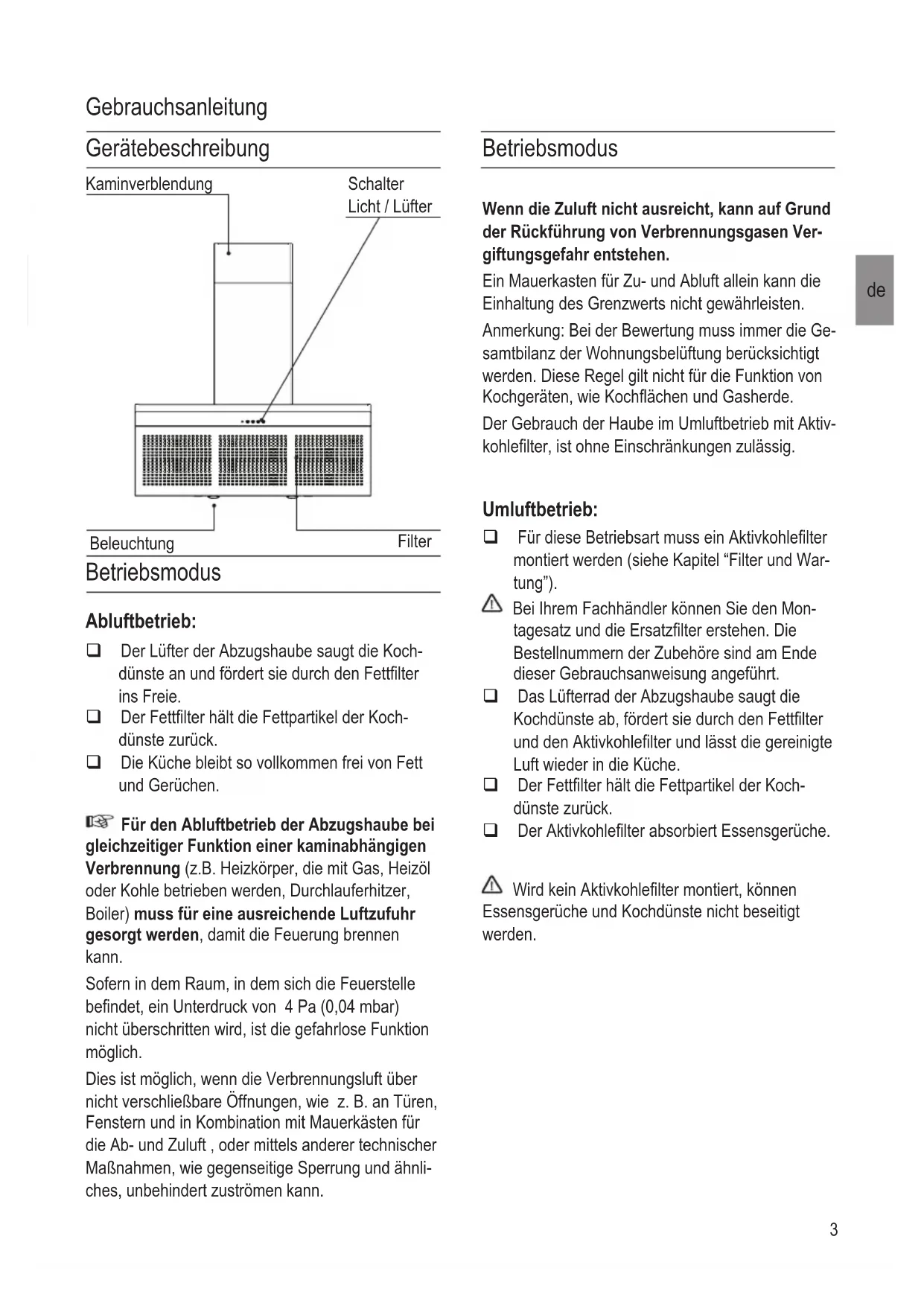 Betriebsmodus Wenn die Zuluft nicht ausreicht, kann auf Grund der Rückführung von Verbrennungsgasen Ver- giftungsgefahr entstehen. Ein Mauerkasten für Zu- und Abluft allein kann die Einhaltung des Grenzwerts nicht gewährleisten. Anmerkung: Bei der Bewertung muss immer die Ge- samtbilanz der Wohnungsbelüftung berücksichtigt werden. Diese Regel gilt nicht für die Funktion von Kochgeräten, wie Kochächen und Gasherde. Der Gebrauch der Haube im Umluftbetrieb mit Aktiv- kohlelter, ist ohne Einschränkungen zulässig. Umluftbetrieb: qFür diese Betriebsart muss ein Aktivkohlelter montiert werden (siehe Kapitel “Filter und War- tung”). Bei Ihrem Fachhändler können Sie den Mon- tagesatz und die Ersatzlter erstehen. Die Bestellnummern der Zubehöre sind am Ende dieser Gebrauchsanweisung angeführt. qDas Lüfterrad der Abzugshaube saugt die Kochdünste ab, fördert sie durch den Fettlter und den Aktivkohlelter und lässt die gereinigte Luft wieder in die Küche. qDer Fettlter hält die Fettpartikel der Koch- dünste zurück. qDer Aktivkohlelter absorbiert Essensgerüche. Wird kein Aktivkohlelter montiert, können Essensgerüche und Kochdünste nicht beseitigt werden. Betriebsmodus Abluftbetrieb: qDer Lüfter der Abzugshaube saugt die Koch- dünste an und fördert sie durch den Fettlter ins Freie. qDer Fettlter hält die Fettpartikel der Koch- dünste zurück. qDie Küche bleibt so vollkommen frei von Fett und Gerüchen. Für den Abluftbetrieb der Abzugshaube bei gleichzeitiger Funktion einer kaminabhängigen Verbrennung (z.B. Heizkörper, die mit Gas, Heizöl oder Kohle betrieben werden, Durchlauferhitzer, Boiler) muss für eine ausreichende Luftzufuhr gesorgt werden, damit die Feuerung brennen kann. Sofern in dem Raum, in dem sich die Feuerstelle bendet, ein Unterdruck von 4 Pa (0,04 mbar) nicht überschritten wird, ist die gefahrlose Funktion möglich. Dies ist möglich, wenn die Verbrennungsluft über nicht verschließbare Öffnungen, wie z. B. an Türen, Fenstern und in Kombination mit Mauerkästen für die Ab- und Zuluft , oder mittels anderer technischer Maßnahmen, wie gegenseitige Sperrung und ähnli- ches, unbehindert zuströmen kann. Beleuchtung Schalter Licht / Lüfter Kaminverblendung Filter Gerätebeschreibung Gebrauchsanleitung4