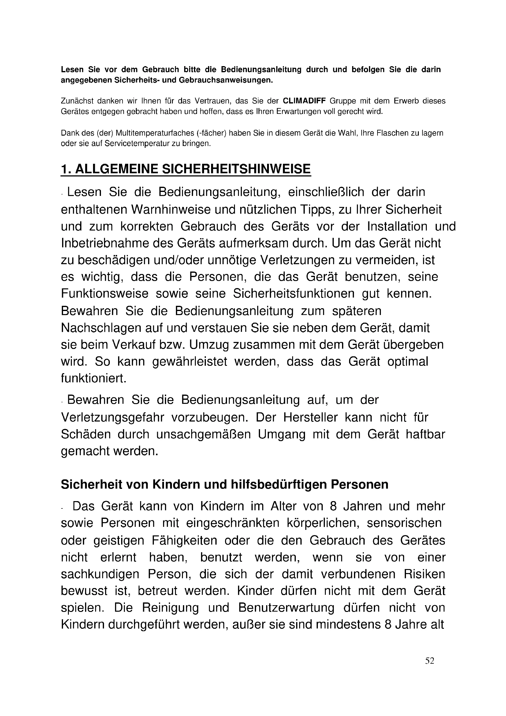This appliance is intended exclusively for the storage of wine.52 Lesen Sie vor dem Gebrauch bitte die Bedienungsanleitung durch und befolgen Sie die darin angegebenen Sicherheits- und Gebrauchsanweisungen. Zunächst danken wir Ihnen für das Vertrauen, das Sie der CLIMADIFF Gruppe mit dem Erwerb dieses Gerätes entgegen gebracht haben und hoffen, dass es Ihren Erwartungen voll gerecht wird. Dank des (der) Multitemperaturfaches (-fächer) haben Sie in diesem Gerät die Wahl, Ihre Flaschen zu lagern oder sie auf Servicetemperatur zu bringen.