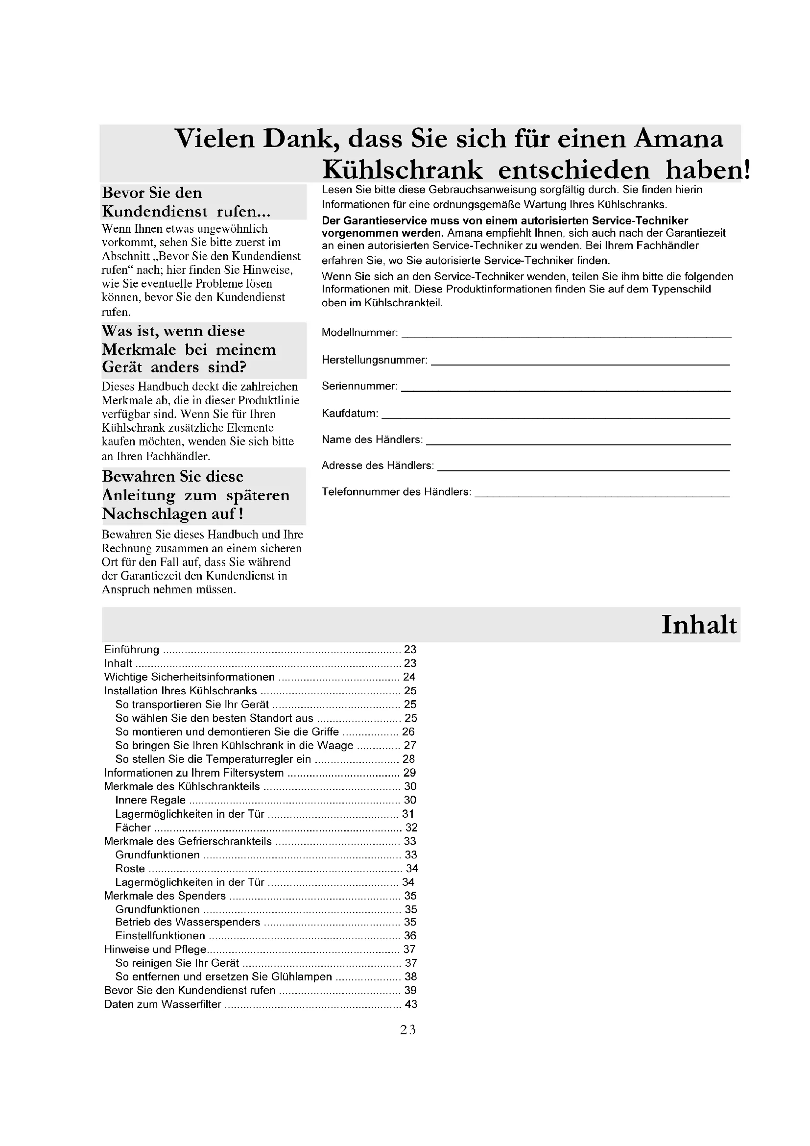 - Lesen Sie bitte diese Gebrauchsanweisung sorgfältig durch. Sie finden hierin Informationen für eine ordnungsgemäße Wartung Ihres Kühlschranks. Der Garantieservice muss von einem autorisierten Service-Techniker vorgenommen werden. Amana empfiehlt Ihnen, sich auch nach der Garantiezeit an einen autorisierten Service-Techniker zu wenden. Bei Ihrem Fachhändler erfahren Sie, wo Sie autorisierte Service-Techniker finden. Wenn Sie sich an den Service-Techniker wenden, teilen Sie ihm bitte die folgenden Informationen mit. Diese Produktinformationen finden Sie auf dem Typenschild oben im Kühlschrankteil. Modellnummer: _____________________________________________________ Herstellungsnummer: ________________________________________________ Seriennummer: _____________________________________________________ Kaufdatum: ________________________________________________________ Name des Händlers: _________________________________________________ Adresse des Händlers: _______________________________________________ Telefonnummer des Händlers: _________________________________________ Bevor Sie den Kundendienst rufen