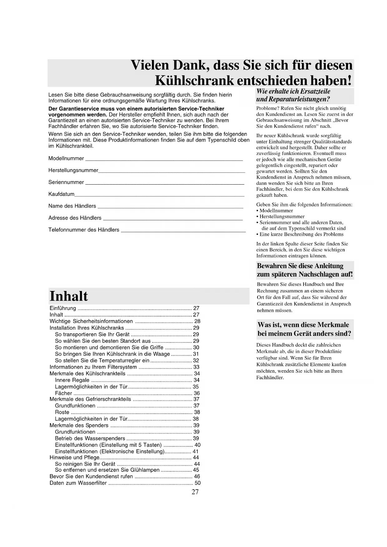 - Eine kurze Beschreibung des Problems In der linken Spalte dieser Seite finden Sie einen Bereich, in den Sie diese wichtigen Informationen eintragen können. Vielen Dank, dass Sie sich für diesen Kühlschrank entschieden haben! Was ist, wenn diese Merkmale bei meinem Gerät anders sind? Einführung ............................................................................. 27 Inhalt ...................................................................................... 27 Wichtige Sicherheitsinformationen ....................................... 28 Installation Ihres Kühlschranks ............................................. 29 So transportieren Sie Ihr Gerät ......................................... 29 So wählen Sie den besten Standort aus ........................... 29 So montieren und demontieren Sie die Griffe .................. 30 So bringen Sie Ihren Kühlschrank in die Waage .............. 31 So stellen Sie die Temperaturregler ein............................ 32 Informationen zu Ihrem Filtersystem .................................... 33 Merkmale des Kühlschrankteils ............................................ 34 Innere Regale .................................................................... 34 Lagermöglichkeiten in der Tür........................................... 35 Fächer ................................................................................ 36 Merkmale des Gefrierschrankteils ........................................ 37 Grundfunktionen ................................................................ 37 Roste .................................................................................. 38 Lagermöglichkeiten in der Tür........................................... 38 Merkmale des Spenders ....................................................... 39 Grundfunktionen ................................................................ 39 Betrieb des Wasserspenders ............................................ 39 Einstellfunktionen (Einstellung mit 5 Tasten) .................... 40 Einstellfunktionen (Elektronische Einstellung).................. 41 Hinweise und Pflege.............................................................. 44 So reinigen Sie Ihr Gerät ................................................... 44 So entfernen und ersetzen Sie Glühlampen ..................... 45 Bevor Sie den Kundendienst rufen ....................................... 46 Daten zum Wasserfilter ......................................................... 50 Inhalt Dieses Handbuch deckt die zahlreichen Merkmale ab, die in dieser Produktlinie verfügbar sind. Wenn Sie für Ihren Kühlschrank zusätzliche Elemente kaufen möchten, wenden Sie sich bitte an Ihren Fachhändler. Bewahren Sie diese Anleitung zum späteren Nachschlagen auf! Bewahren Sie dieses Handbuch und Ihre Rechnung zusammen an einem sicheren Ort für den Fall auf, dass Sie während der Garantiezeit den Kundendienst in Anspruch nehmen müssen.28 Wichtige Sicherheitsinformationen Alle Merkmale auf einen Blick