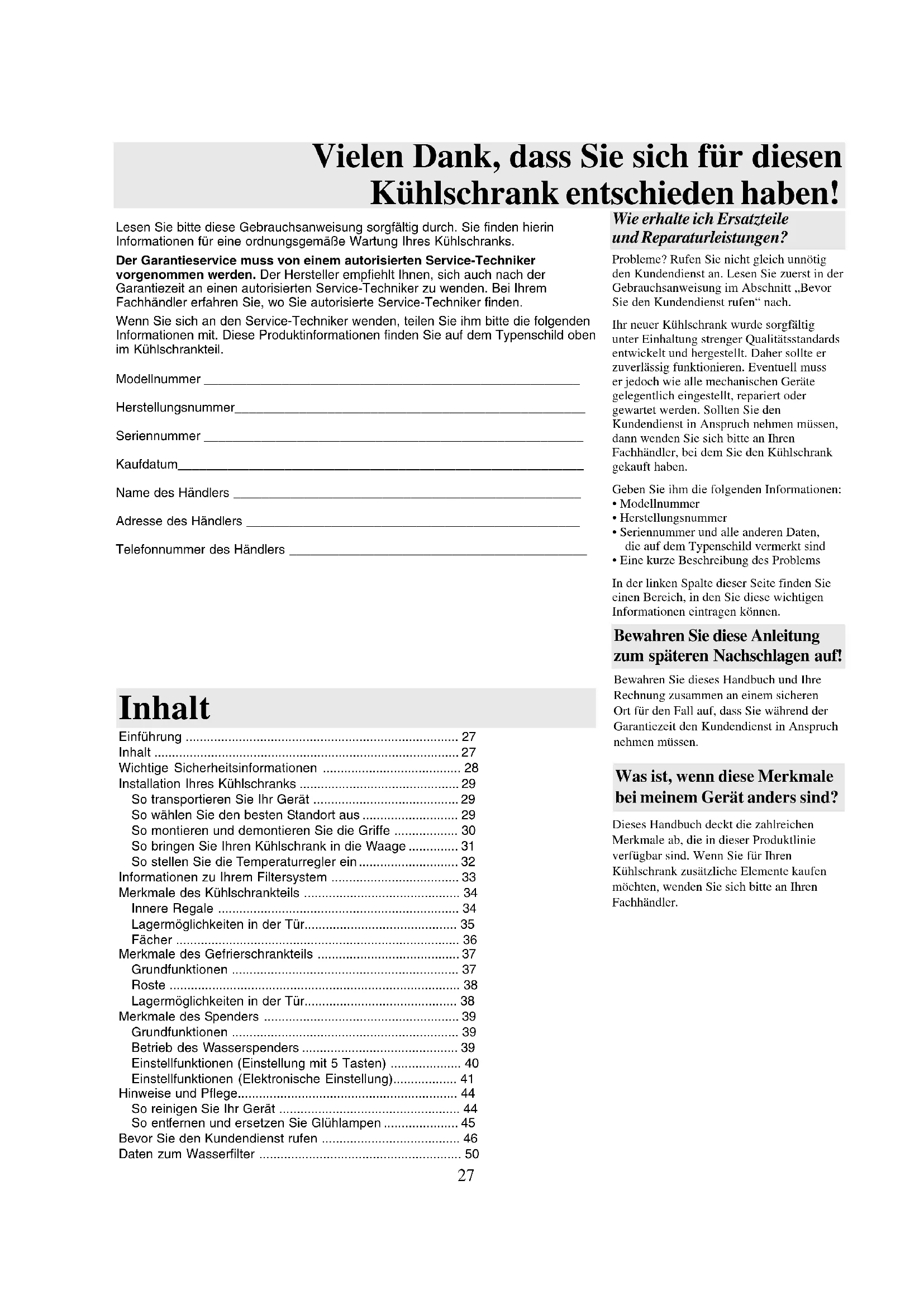 Lesen Sieitte diese Gebrauchsanweisung sorgfaltig durch. Sie finden hierin Informationen fur eine ordnungsgemae Wartung Ihres Kuhlschranks.