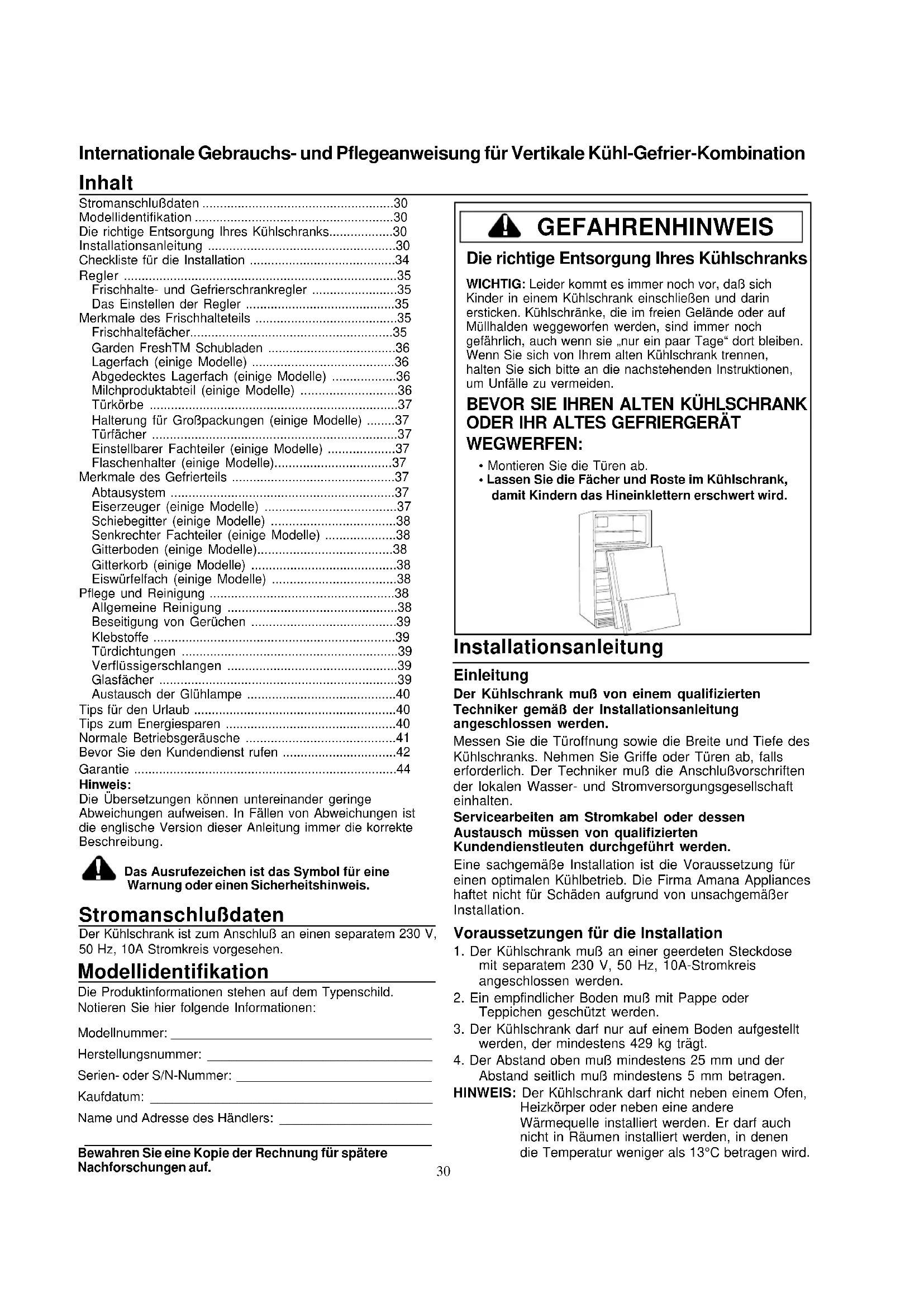 Internationale Gebrauchs- und Pflegeanweisung für Vertikale Kuhl-Gefrier-Kombination Inhalt