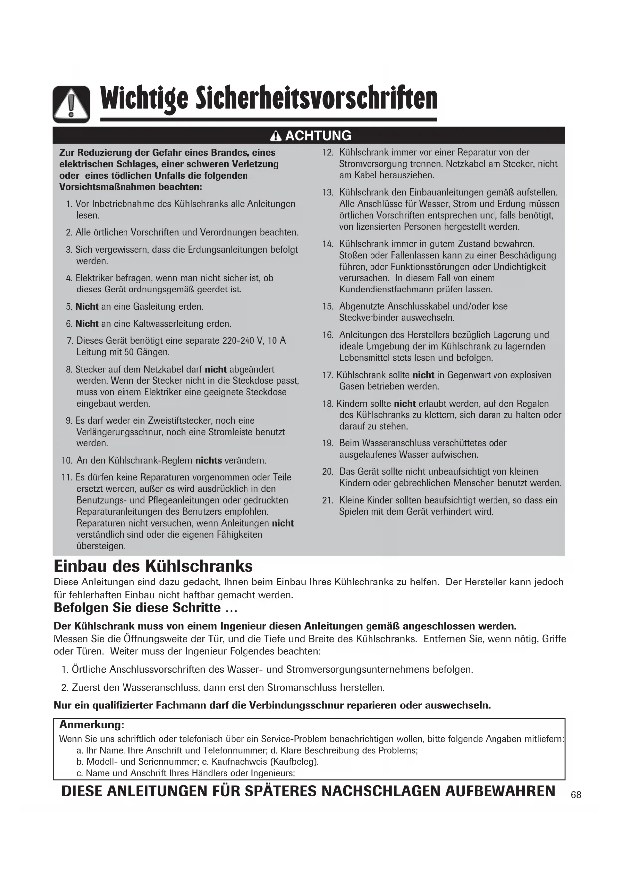 Der Kühlschrank muss von einem Ingenieur diesen Anleitungen gemäß angeschlossen werden.