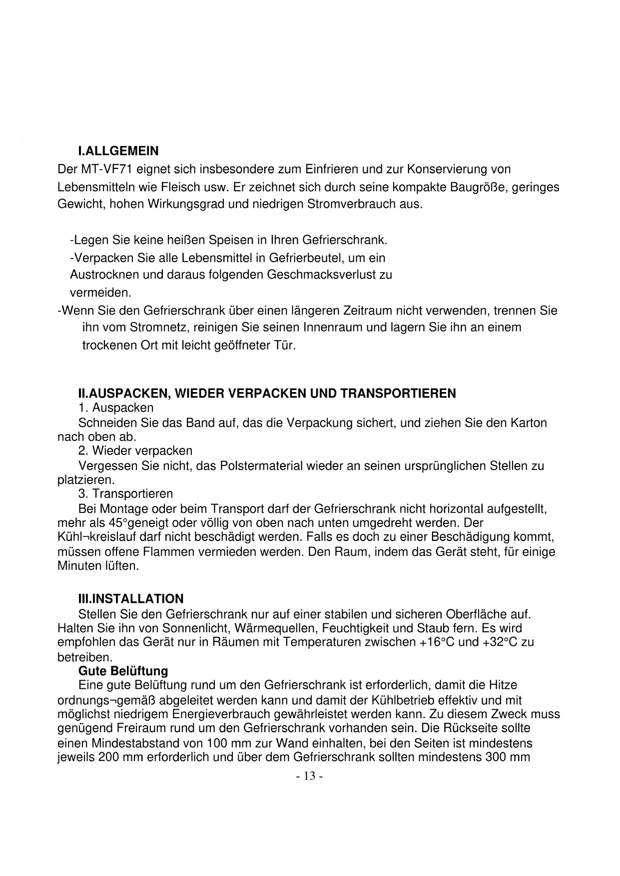 I.ALLGEMEIN Der MT-VF71 eignet sich insbesondere zum Einfrieren und zur Konservierung von Lebensmitteln wie Fleisch usw. Er zeichnet sich durch seine kompakte Baugröße, geringes Gewicht, hohen Wirkungsgrad und niedrigen Stromverbrauch aus. -Legen Sie keine heißen Speisen in Ihren Gefrierschrank. -Verpacken Sie alle Lebensmittel in Gefrierbeutel, um ein Austrocknen und daraus folgenden Geschmacksverlust zu vermeiden. -Wenn Sie den Gefrierschrank über einen längeren Zeitraum nicht verwenden, trennen Sie ihn vom Stromnetz, reinigen Sie seinen Innenraum und lagern Sie ihn an einem trockenen Ort mit leicht geöffneter Tür.