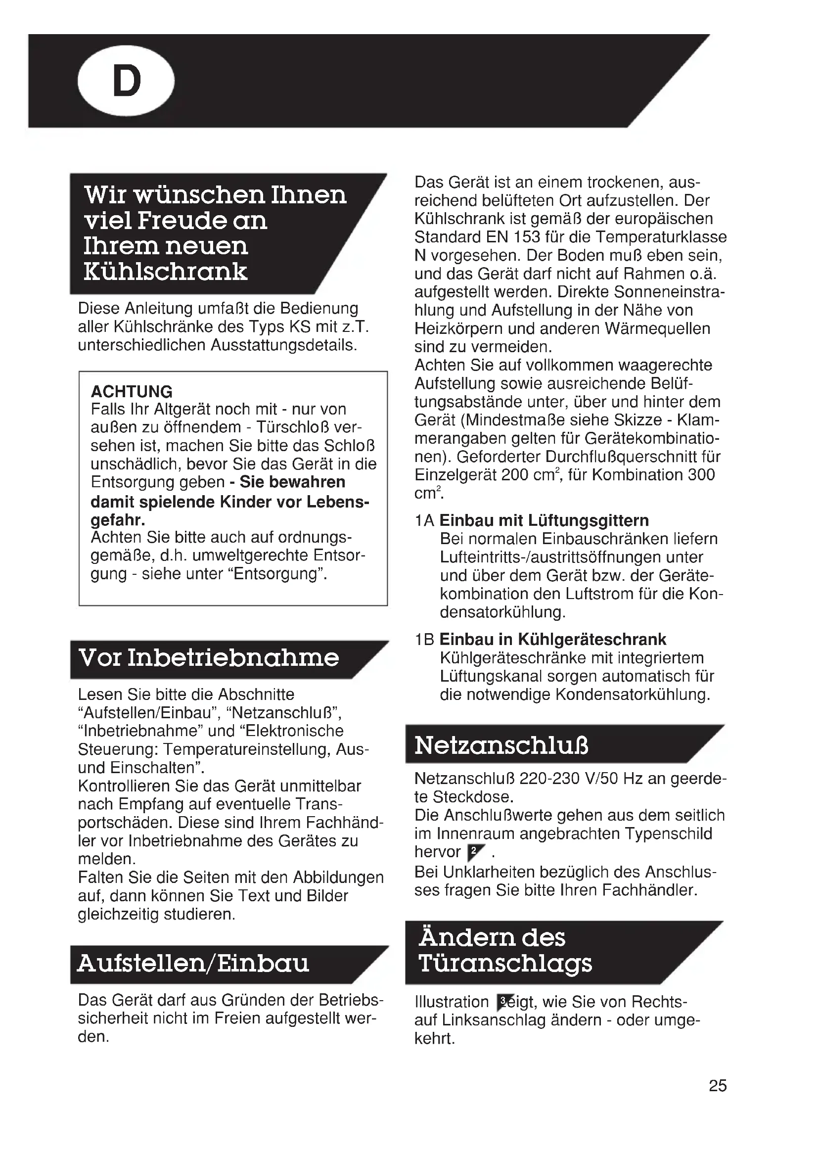 1A Einbau mit Lüftungsgittern Bei normalen Einbauschränken liefern Lufteintritts-/austrittsöffnungen unter und über dem Gerät bzw. der Geräte- kombination den Luftstrom für die Kon- densatorkühlung. 1B Einbau in Kühlgeräteschrank Kühlgeräteschränke mit integriertem Lüftungskanal sorgen automatisch für die notwendige Kondensatorkühlung. Netzanschluß 220-230 V/50 Hz an geerde- te Steckdose. Die Anschlußwerte gehen aus dem seitlich im Innenraum angebrachten Typenschild hervor . Bei Unklarheiten bezüglich des Anschlus- ses fragen Sie bitte Ihren Fachhändler. Illustration zeigt, wie Sie von Rechts- auf Linksanschlag ändern - oder umge- kehrt.