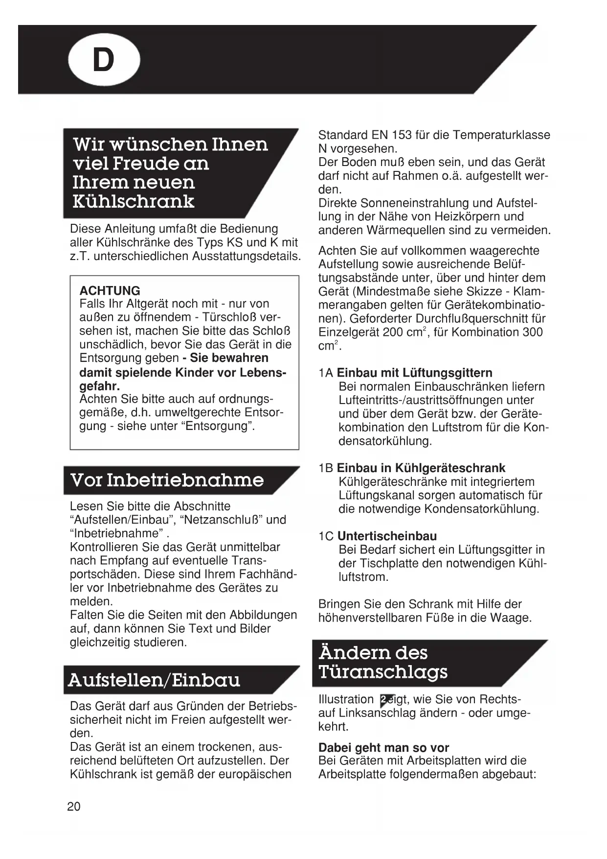 Diese Anleitung umfaßt die Bedienung aller Kühlschränke des Typs KS und K mit z.T. unterschiedlichen Ausstattungsdetails. ACHTUNG Falls Ihr Altgerät noch mit - nur von außen zu öffnendem - Türschloß ver- sehen ist, machen Sie bitte das Schloß unschädlich, bevor Sie das Gerät in die Entsorgung geben - Sie bewahren damit spielende Kinder vor Lebens- gefahr. Achten Sie bitte auch auf ordnungs- gemäße, d.h. umweltgerechte Entsor- gung - siehe unter “Entsorgung”. Lesen Sie bitte die Abschnitte “Aufstellen/Einbau”, “Netzanschluß” und “Inbetriebnahme” . Kontrollieren Sie das Gerät unmittelbar nach Empfang auf eventuelle Trans- portschäden. Diese sind Ihrem Fachhänd- ler vor Inbetriebnahme des Gerätes zu melden. Falten Sie die Seiten mit den Abbildungen auf, dann können Sie Text und Bilder gleichzeitig studieren. Das Gerät darf aus Gründen der Betriebs- sicherheit nicht im Freien aufgestellt wer- den. Das Gerät ist an einem trockenen, aus- reichend belüfteten Ort aufzustellen. Der Kühlschrank ist gemäß der europäischen Vor Inbetriebnahme Standard EN 153 für die Temperaturklasse N vorgesehen. Der Boden muß eben sein, und das Gerät darf nicht auf Rahmen o.ä. aufgestellt wer- den. Direkte Sonneneinstrahlung und Aufstel- lung in der Nähe von Heizkörpern und anderen Wärmequellen sind zu vermeiden. Achten Sie auf vollkommen waagerechte Aufstellung sowie ausreichende Belüf- tungsabstände unter, über und hinter dem Gerät (Mindestmaße siehe Skizze - Klam- merangaben gelten für Gerätekombinatio- nen). Geforderter Durchflußquerschnitt für Einzelgerät 200 cm