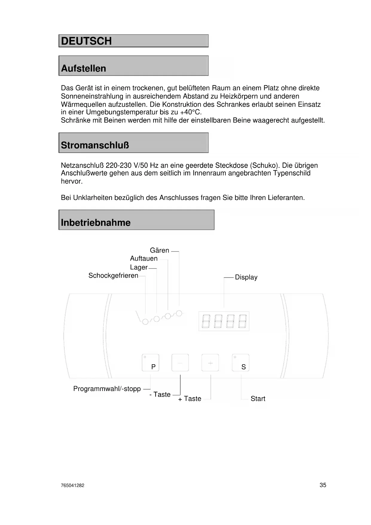 Disposal If the cabinet is to be disposed of, please do so in an environmentally correct way. There are special requirements/conditions to be observed.765041282 35 DEUTSCH Aufstellen Das Gerät ist in einem trockenen, gut belüfteten Raum an einem Platz ohne direkte Sonneneinstrahlung in ausreichendem Abstand zu Heizkörpern und anderen Wärmequellen aufzustellen. Die Konstruktion des Schrankes erlaubt seinen Einsatz in einer Umgebungstemperatur bis zu +40°C. Schränke mit Beinen werden mit hilfe der einstellbaren Beine waagerecht aufgestellt. Stromanschluß Netzanschluß 220-230 V/50 Hz an eine geerdete Steckdose (Schuko). Die übrigen Anschlußwerte gehen aus dem seitlich im Innenraum angebrachten Typenschild hervor. Bei Unklarheiten bezüglich des Anschlusses fragen Sie bitte Ihren Lieferanten. Inbetriebnahme