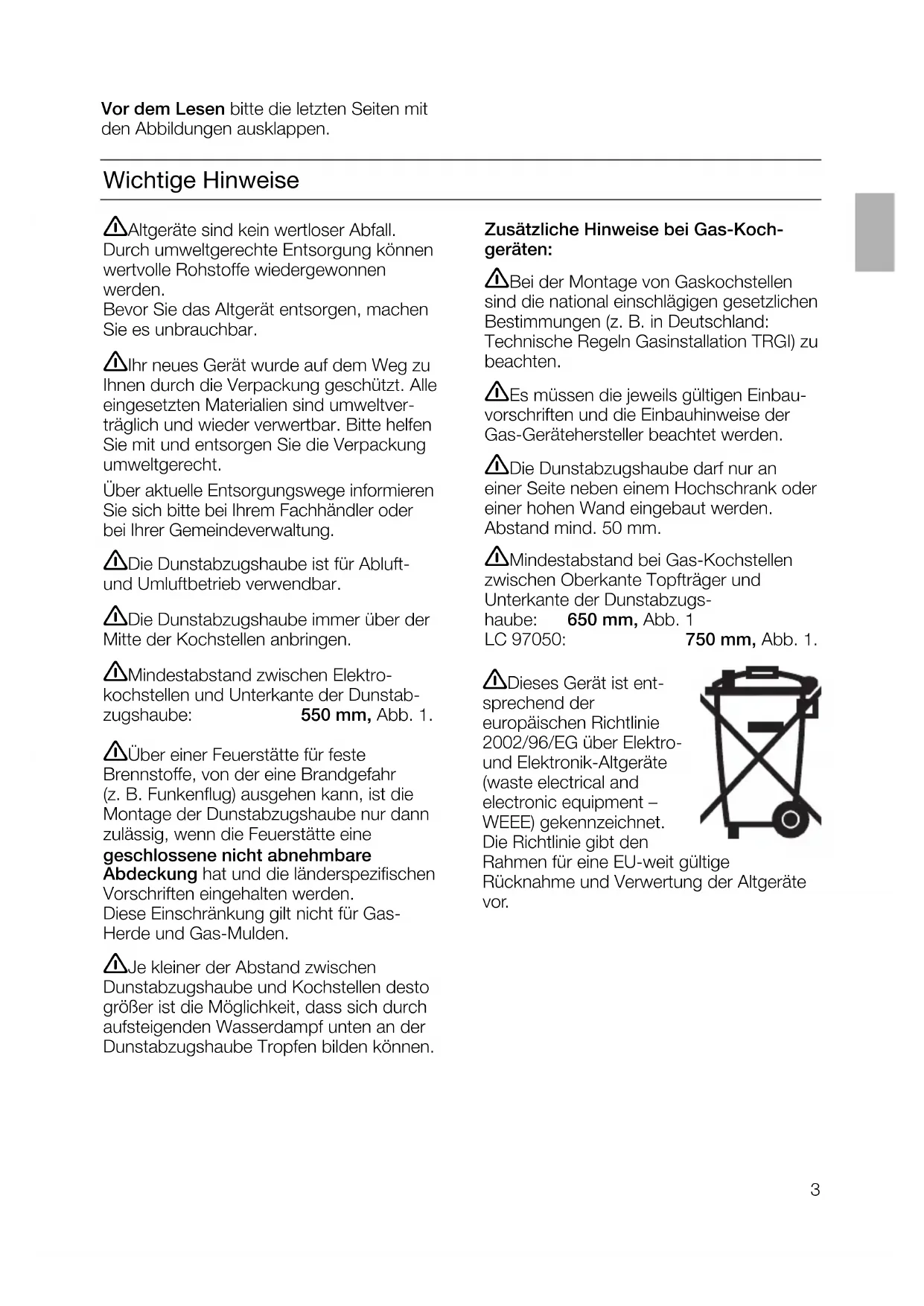 tr2 de Seite 03–07 en page 08–12 fr page 13 – 17 nl pagina 18 – 22 it pagina 23– 27 es página 28– 32 pt página 33– 37 el Σελίδα 38 – 42 sv sid 43 – 47 no side 48 – 52 fi sivu 53 – 57 da side 58 – 62 tr sayfa 63 – 673 Wichtige Hinweise Zusätzliche Hinweise bei Gas-Koch- geräten: Bei der Montage von Gaskochstellen sind die national einschlägigen gesetzlichen Bestimmungen (z. B. in Deutschland: Technische Regeln Gasinstallation TRGI) zu beachten. Es müssen die jeweils gültigen Einbau- vorschriften und die Einbauhinweise der Gas-Gerätehersteller beachtet werden. Die Dunstabzugshaube darf nur an einer Seite neben einem Hochschrank oder einer hohen Wand eingebaut werden. Abstand mind. 50 mm. Mindestabstand bei Gas-Kochstellen zwischen Oberkante Topfträger und Unterkante der Dunstabzugs- haube: 650 mm, Abb. 1 LC 97050: 750 mm, Abb. 1. Altgeräte sind kein wertloser Abfall. Durch umweltgerechte Entsorgung können wertvolle Rohstoffe wiedergewonnen werden. Bevor Sie das Altgerät entsorgen, machen Sie es unbrauchbar. Ihr neues Gerät wurde auf dem Weg zu Ihnen durch die Verpackung geschützt. Alle eingesetzten Materialien sind umweltver- träglich und wieder verwertbar. Bitte helfen Sie mit und entsorgen Sie die Verpackung umweltgerecht. Über aktuelle Entsorgungswege informieren Sie sich bitte bei Ihrem Fachhändler oder bei Ihrer Gemeindeverwaltung. Die Dunstabzugshaube ist für Abluft- und Umluftbetrieb verwendbar. Die Dunstabzugshaube immer über der Mitte der Kochstellen anbringen. Mindestabstand zwischen Elektro- kochstellen und Unterkante der Dunstab- zugshaube: 550 mm, Abb. 1. Über einer Feuerstätte für feste Brennstoffe, von der eine Brandgefahr (z. B. Funkenflug) ausgehen kann, ist die Montage der Dunstabzugshaube nur dann zulässig, wenn die Feuerstätte eine geschlossene nicht abnehmbare Abdeckung hat und die länderspezifischen Vorschriften eingehalten werden. Diese Einschränkung gilt nicht für Gas- Herde und Gas-Mulden. Je kleiner der Abstand zwischen Dunstabzugshaube und Kochstellen desto größer ist die Möglichkeit, dass sich durch aufsteigenden Wasserdampf unten an der Dunstabzugshaube Tropfen bilden können. Vor dem Lesen bitte die letzten Seiten mit den Abbildungen ausklappen. Dieses Gerät ist ent- sprechend der europäischen Richtlinie 2002/96/EG über Elektro- und Elektronik-Altgeräte (waste electrical and electronic equipment – WEEE) gekennzeichnet. Die Richtlinie gibt den Rahmen für eine EU-weit gültige Rücknahme und Verwertung der Altgeräte vor.4 Vor der Montage Abluftbetrieb Abb. 2 Die Abluft wird über einen Lüftungsschacht nach oben, oder direkt durch die Außen- wand ins Freie geleitet.