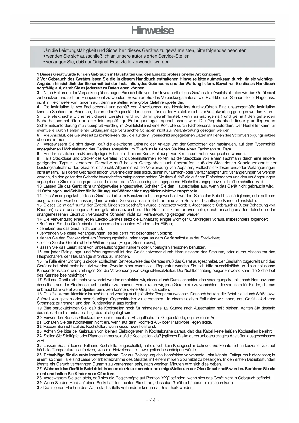 - lassen Sie das Gerät nicht von unbeaufsichtigten Kindern oder unbefugten Personen benutzen. 15 Vor jeder Reinigungs- und Wartungsarbeit ist das Gerät entweder durch Herausziehen des Steckers, oder durch Abschalten des Hauptschalters der Hausanlage stromlos zu machen. 16 Im Falle einer Störung und/oder schlechten Betriebsweise des Gerätes muß das Gerät ausgeschaltet, der Gashahn zugedreht und das Gerät selbst nicht mehr benutzt werden. Zwecks einer eventuellen Reparatur wenden Sie sich bitte ausschließlich an die zugelassene Kundendienststelle und verlangen Sie die Verwendung von Original-Ersatzteilen. Die Nichtbeachtung obiger Hinweise kann die Sicherheit des Gerätes beeinträchtigen. 17 Soll das Gerät nicht mehr verwendet werden empfehlen wir, dieses durch Durchschneiden des Versorgungskabels, nach Herausziehen desselben aus der Steckdose, unbrauchbar zu machen. Ferner raten wir, jene Geräteteile zu vernichten, die vor allem für Kinder, die das unbrauchbare Gerät zum Spielen benutzen könnten, eine Gefahr darstellen. 18 Das Glaskeramikkochfeld ist stoßfest und verträgt auch plötzliche Temperaturwechsel. Dennoch besteht die Gefahr, es durch Stöße bzw. Aufprall von spitzen oder scharfkantigen Gegenständen zu zerbrechen. In einem solchen Fall raten wir Ihnen, das Gerät sofort vom Stromnetz zu trennen und den Kundendienst anzufordern. 19 Bitte berücksichtigen Sie, daß die Kochstellen noch für mindestens 1/2 Stunde nach Ausschalten heiß bleiben. Achten Sie deshalb darauf, daß nichts unbeabsichtigt darauf abgelegt wird. 20 Verwenden Sie das Glaskeramikkochfeld nicht als Ablagefläche für Gegenstände, egal welcher Art. 21 Schalten Sie die Kochstellen nicht ein, wenn auf dem Kochfeld Alu- oder Plastikfolie liegen sollte. 22 Fassen Sie nicht auf die Kochstellen, wenn diese noch heiß sind. 23 Achten Sie bitte bei Gebrauch von kleinen Elektrogeräten in Kochfeldnähe darauf, daß das Kabel keine heißen Kochstellen berührt. 24 Stellen Sie Stieltöpfe oder Pfannen immer so auf die Kochstellen, daß jegliches Risiko durch unbeabsichtigtes Anstoßen ausgeschlossen wird. 25 Lassen Sie auf keinen Fall eine Kochstelle eingeschaltet, auf die sich kein Kochgeschirr befindet. Sie könnte sich in kürzester Zeit auf höchste Temperaturen aufheizen, was die Heizelemente unweigerlich beschädigen würde. 26 Ratschläge für die erste Inbetriebnahme. Der zur Befestigung des Kochfeldes verwendete Leim könnte Fettspuren hinterlassen; in einem solchen Falle sind diese vor Inbetriebnahme des Gerätes mit einem milden Spülmittel zu beseitigen. In den ersten Betriebsstunden könnte ein Geruch verbrannten Gummis zu vernehmen sein, nach wenigen Minuten wird sich dies geben. 27 Während das Gerät in Betrieb ist, können die Heizelemente und einige Stellen an der Ofentür sehr heiß werden. Berühren Sie sie nicht und halten Sie Kinder vom Ofen fern. 28 Vergewissern Sie sich stets, daß sich die Reglerknöpfe auf Position ”•”/”¡” befinden, wenn sich das Gerät nicht in Gebrauch befindet. 29 Wenn Sie den Herd auf einen Sockel stellen, achten Sie darauf, dass das Gerät nicht herunter rutschen kann. 30 Die internen Flächen des Wärmefachs (falls vorhanden) können äußerst heiß werden. Um die Leistungsfähigkeit und Sicherheit dieses Gerätes zu gewährleisten, bitte folgendes beachten
