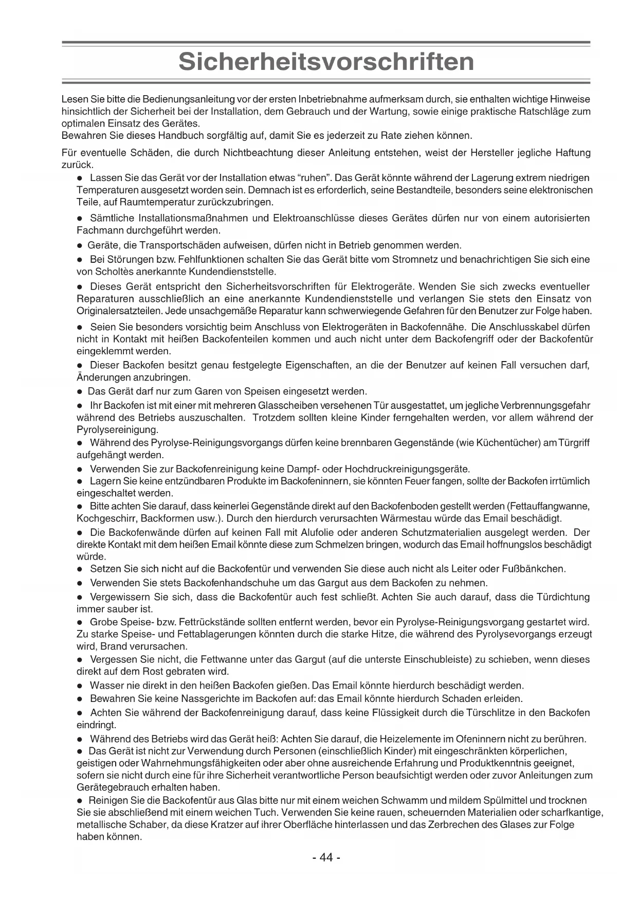 - Die Bedienungsanleitung beschreibt detailliert die Funktionen, mit denen das Gerät ausgestattet ist. Sie finden hier außerdem kulinarische Ratschläge, die es Ihnen erlauben werden, die Leistungen dieses Backofens bestmöglichst zu nutzen.- 43 - Inhaltsverzeichnis Sicherheitsvorschriften ............................................................................................................... 44 Installation und Befestigung ....................................................................................................... 45 Installation ................................................................................................................................................ 45 Befestigung ............................................................................................................................................... 45 Elektrischer Anschluss................................................................................................................ 46 Technische Daten ......................................................................................................................... 47 Die richtige Pflege Ihres Gerätes ...........................................................................................48-49 Allgemeine Hinweise ................................................................................................................................ 48 Demontage der Backofentür ..................................................................................................................... 48 Backofentürdichtung ................................................................................................................................. 48 Außenflächen des Gerätes ....................................................................................................................... 48 Glasabdeckung der Backofenlampe ......................................................................................................... 48 Austausch der Backofenlampe ................................................................................................................. 48 Zubehör .................................................................................................................................................... 49 Katalyse-Selbstreinigung ............................................................................................................ 49 Manuelle Reinigung .....................................................................................................................49 Pyrolyse-Selbstreinigung ............................................................................................................ 50 Umweltschutz ............................................................................................................................... 51 Reinigung und Pflege .................................................................................................................. 51- 44 - Sicherheitsvorschriften Lesen Sie bitte die Bedienungsanleitung vor der ersten Inbetriebnahme aufmerksam durch, sie enthalten wichtige Hinweise hinsichtlich der Sicherheit bei der Installation, dem Gebrauch und der Wartung, sowie einige praktische Ratschläge zum optimalen Einsatz des Gerätes. Bewahren Sie dieses Handbuch sorgfältig auf, damit Sie es jederzeit zu Rate ziehen können. Für eventuelle Schäden, die durch Nichtbeachtung dieser Anleitung entstehen, weist der Hersteller jegliche Haftung zurück. l Lassen Sie das Gerät vor der Installation etwas “ruhen”. Das Gerät könnte während der Lagerung extrem niedrigen Temperaturen ausgesetzt worden sein. Demnach ist es erforderlich, seine Bestandteile, besonders seine elektronischen Teile, auf Raumtemperatur zurückzubringen. l Sämtliche Installationsmaßnahmen und Elektroanschlüsse dieses Gerätes dürfen nur von einem autorisierten Fachmann durchgeführt werden. l Geräte, die Transportschäden aufweisen, dürfen nicht in Betrieb genommen werden. l Bei Störungen bzw. Fehlfunktionen schalten Sie das Gerät bitte vom Stromnetz und benachrichtigen Sie sich eine von Scholtès anerkannte Kundendienststelle. l Dieses Gerät entspricht den Sicherheitsvorschriften für Elektrogeräte. Wenden Sie sich zwecks eventueller Reparaturen ausschließlich an eine anerkannte Kundendienststelle und verlangen Sie stets den Einsatz von Originalersatzteilen. Jede unsachgemäße Reparatur kann schwerwiegende Gefahren für den Benutzer zur Folge haben. l Seien Sie besonders vorsichtig beim Anschluss von Elektrogeräten in Backofennähe. Die Anschlusskabel dürfen nicht in Kontakt mit heißen Backofenteilen kommen und auch nicht unter dem Backofengriff oder der Backofentür eingeklemmt werden. l Dieser Backofen besitzt genau festgelegte Eigenschaften, an die der Benutzer auf keinen Fall versuchen darf, Änderungen anzubringen. l Das Gerät darf nur zum Garen von Speisen eingesetzt werden. l Ihr Backofen ist mit einer mit mehreren Glasscheiben versehenen Tür ausgestattet, um jegliche Verbrennungsgefahr während des Betriebs auszuschalten. Trotzdem sollten kleine Kinder ferngehalten werden, vor allem während der Pyrolysereinigung. l Während des Pyrolyse-Reinigungsvorgangs dürfen keine brennbaren Gegenstände (wie Küchentücher) am Türgriff aufgehängt werden. l Verwenden Sie zur Backofenreinigung keine Dampf- oder Hochdruckreinigungsgeräte. l Lagern Sie keine entzündbaren Produkte im Backofeninnern, sie könnten Feuer fangen, sollte der Backofen irrtümlich eingeschaltet werden. l Bitte achten Sie darauf, dass keinerlei Gegenstände direkt auf den Backofenboden gestellt werden (Fettauffangwanne, Kochgeschirr, Backformen usw.). Durch den hierdurch verursachten Wärmestau würde das Email beschädigt. l Die Backofenwände dürfen auf keinen Fall mit Alufolie oder anderen Schutzmaterialien ausgelegt werden. Der direkte Kontakt mit dem heißen Email könnte diese zum Schmel