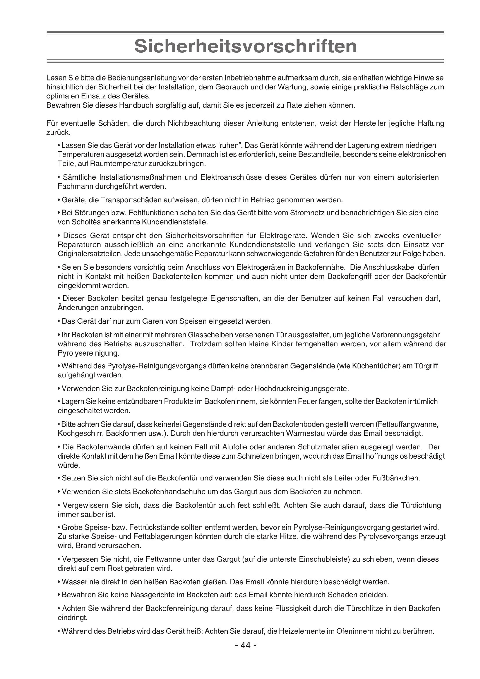 - Die Bedienungsanleitung beschreibt detailliert die Funktionen, mit denen das Gerät ausgestattet ist. Sie finden hier außerdem kulinarische Ratschläge, die es Ihnen erlauben werden, die Leistungen dieses Backofens bestmöglichst zu nutzen.- 43 - Inhaltsverzeichnis Sicherheitsvorschriften ............................................................................................................... 44 Installation und Befestigung ....................................................................................................... 45 Installation ................................................................................................................................................ 45 Befestigung ............................................................................................................................................... 45 Elektrischer Anschluss................................................................................................................ 46 Technische Daten ......................................................................................................................... 47 Die richtige Pflege Ihres Gerätes ...........................................................................................48-49 Allgemeine Hinweise ................................................................................................................................ 48 Demontage der Backofentür ..................................................................................................................... 48 Backofentürdichtung ................................................................................................................................. 48 Außenflächen des Gerätes ....................................................................................................................... 48 Glasabdeckung der Backofenlampe ......................................................................................................... 48 Austausch der Backofenlampe ................................................................................................................. 48 Zubehör .................................................................................................................................................... 49 Katalyse-Selbstreinigung ............................................................................................................ 49 Manuelle Reinigung .....................................................................................................................49 Pyrolyse-Selbstreinigung ............................................................................................................ 50 Umweltschutz ............................................................................................................................... 51 Reinigung und Pflege .................................................................................................................. 51- 44 - Sicherheitsvorschriften Lesen Sie bitte die Bedienungsanleitung vor der ersten Inbetriebnahme aufmerksam durch, sie enthalten wichtige Hinweise hinsichtlich der Sicherheit bei der Installation, dem Gebrauch und der Wartung, sowie einige praktische Ratschläge zum optimalen Einsatz des Gerätes. Bewahren Sie dieses Handbuch sorgfältig auf, damit Sie es jederzeit zu Rate ziehen können. Für eventuelle Schäden, die durch Nichtbeachtung dieser Anleitung entstehen, weist der Hersteller jegliche Haftung zurück.