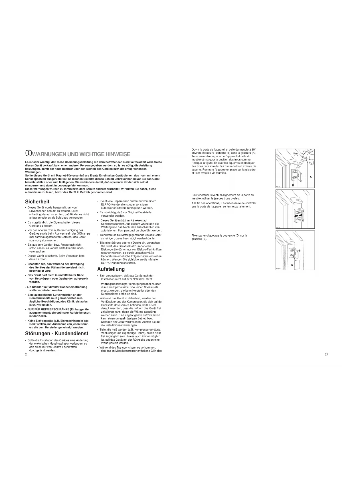Es ist sehr wichtig, daß diese Bedienungsanleitung mit dem betreffenden Gerät aufbewahrt wird. Sollte dieses Gerät verkauft bzw. einer anderen Person gegeben werden, so ist es nötig, die Anleitung beizufügen, damit der neue Besitzer über den Betrieb des Gerätes bzw. die entsprechenden Warnungen. Sollte dieses Gerät mit Magnet-Türverschluß als Ersatz für ein altes Gerät dienen, das noch mit einem Schnappschloß ausgerüstet ist, so machen Sie bitte dieses Schloß unbrauchbar, bevor Sie das Gerät beiseite stellen oder zum Müll geben. Sie verhindern damit, daß spielende Kinder sich selbst einsperren und damit in Lebensgefahr kommen. Diese Warnungen wurden zu Ihrem bzw. dem Schutz anderer erarbeitet. Wir bitten Sie daher, diese aufmerksam zu lesen, bevor das Gerät in Betrieb genommen wird. Sicherheit