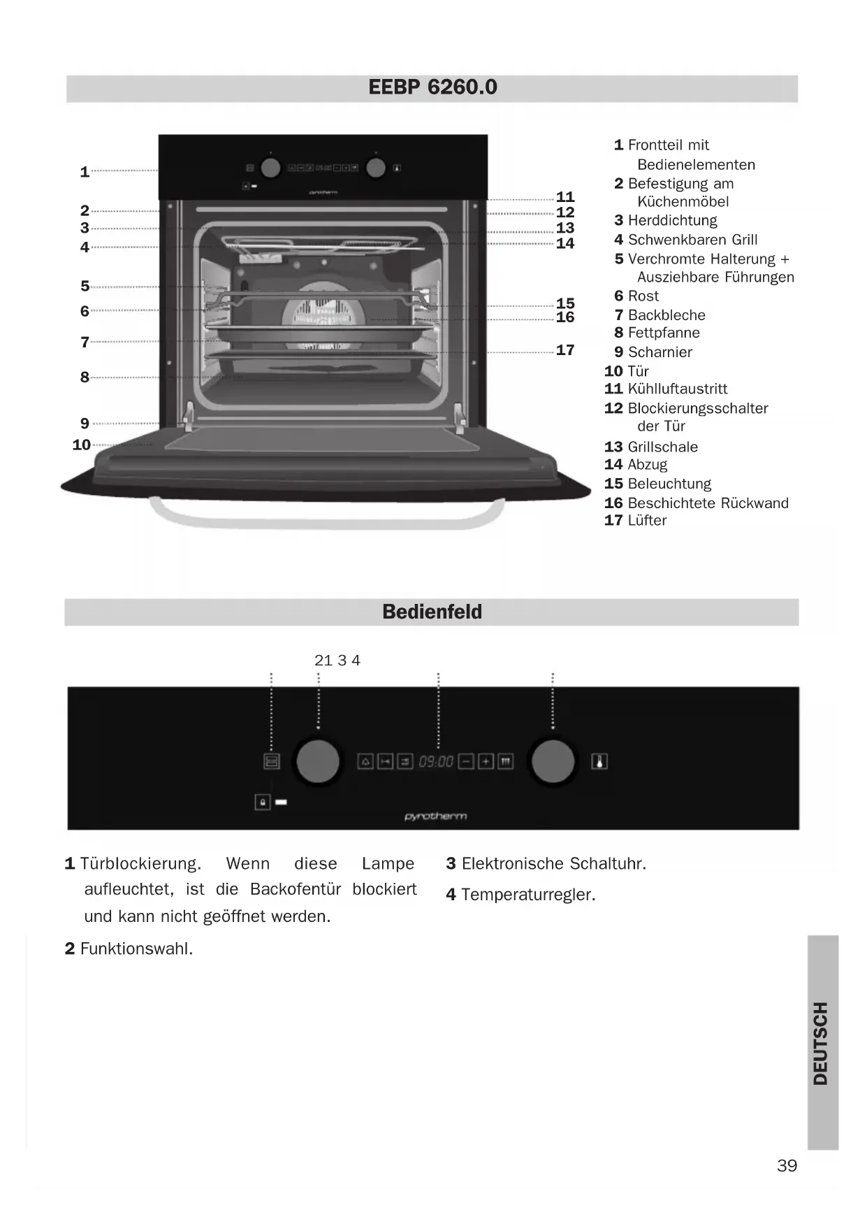 fonction sur la position 0 et attendez que le témoin s’éteigne. J’ai placé le sélecteur de fonction sur la position 0 et la porte est débloquée mais le symbole reste allumé et l’écran affiche le temps restant du cycle de nettoyage. Vous n’avez pas suivi correctement les instructions données pour l’annulation. Suivez les instructions d’annulation de la programmation pyrolyse de l’horloge. 3172653-000 KUPPERBUSCH:- 3/4/13 11:00 Página 3839 DEUTSCH Bedienfeld 1 Türblockierung. Wenn diese Lampe aufleuchtet, ist die Backofentür blockiert und kann nicht geöffnet werden. 2 Funktionswahl. 3 Elektronische Schaltuhr. 4 Temperaturregler. 1 Frontteil mit Bedienelementen 2 Befestigung am Küchenmöbel 3 Herddichtung 4 Schwenkbaren Grill 5 Verchromte Halterung + Ausziehbare Führungen 6 Rost 7 Backbleche 8 Fettpfanne 9 Scharnier 10 Tür 11 Kühlluftaustritt 12 Blockierungsschalter der Tür 13 Grillschale 14 Abzug 15 Beleuchtung 16 Beschichtete Rückwand 17 Lüfter EEBP 6260.0
