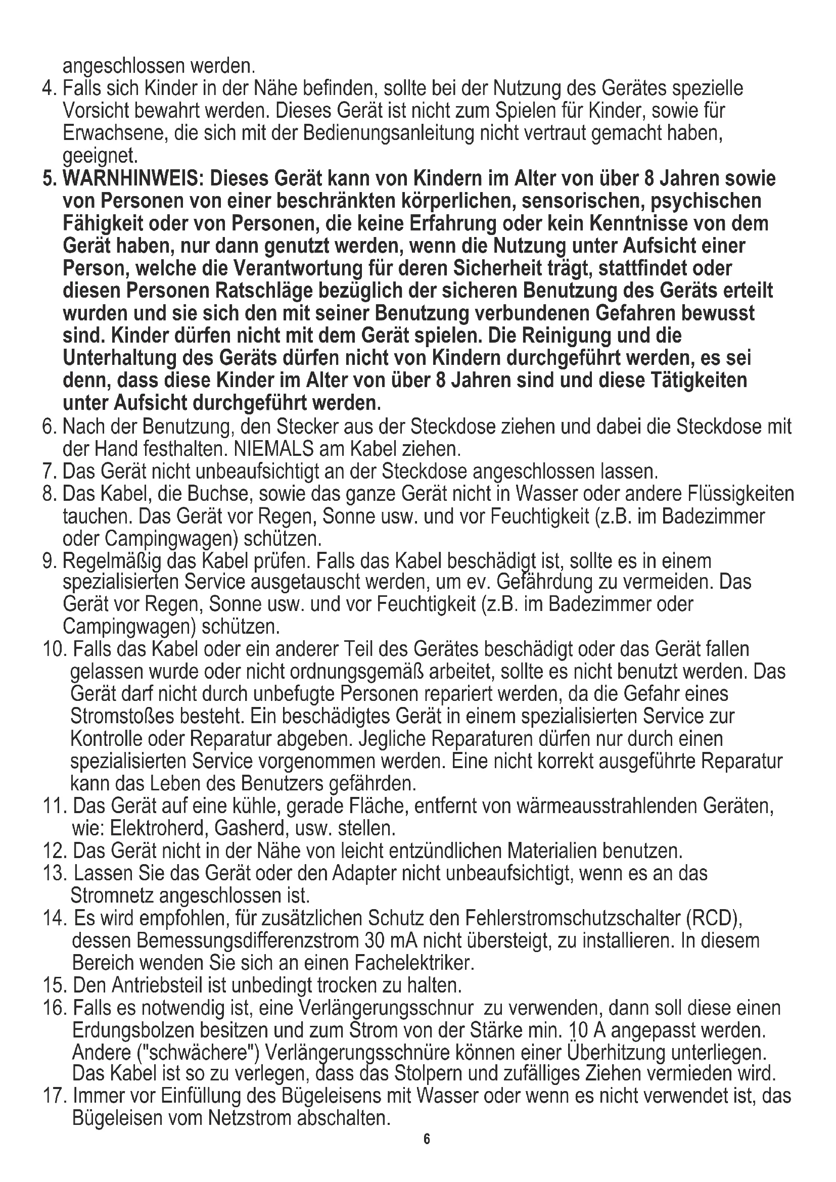 5. WARNHINWEIS: Dieses Gerät kann von Kindern im Alter von über 8 Jahren sowie
