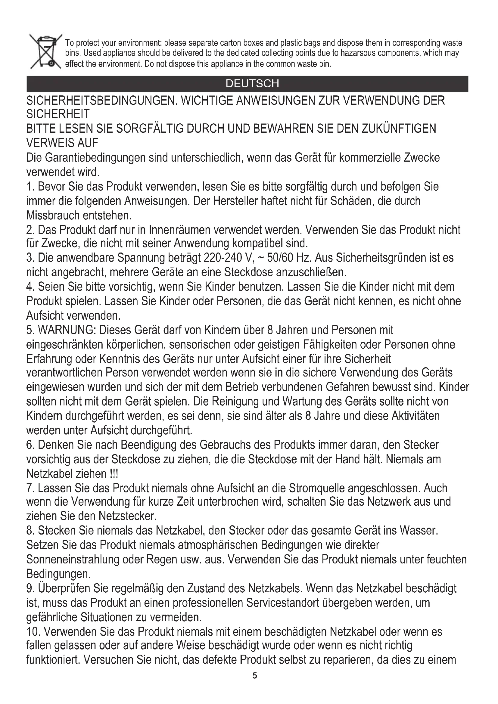 5. WARNUNG: Dieses Gerät darf von Kindern über 8 Jahren und Personen mit