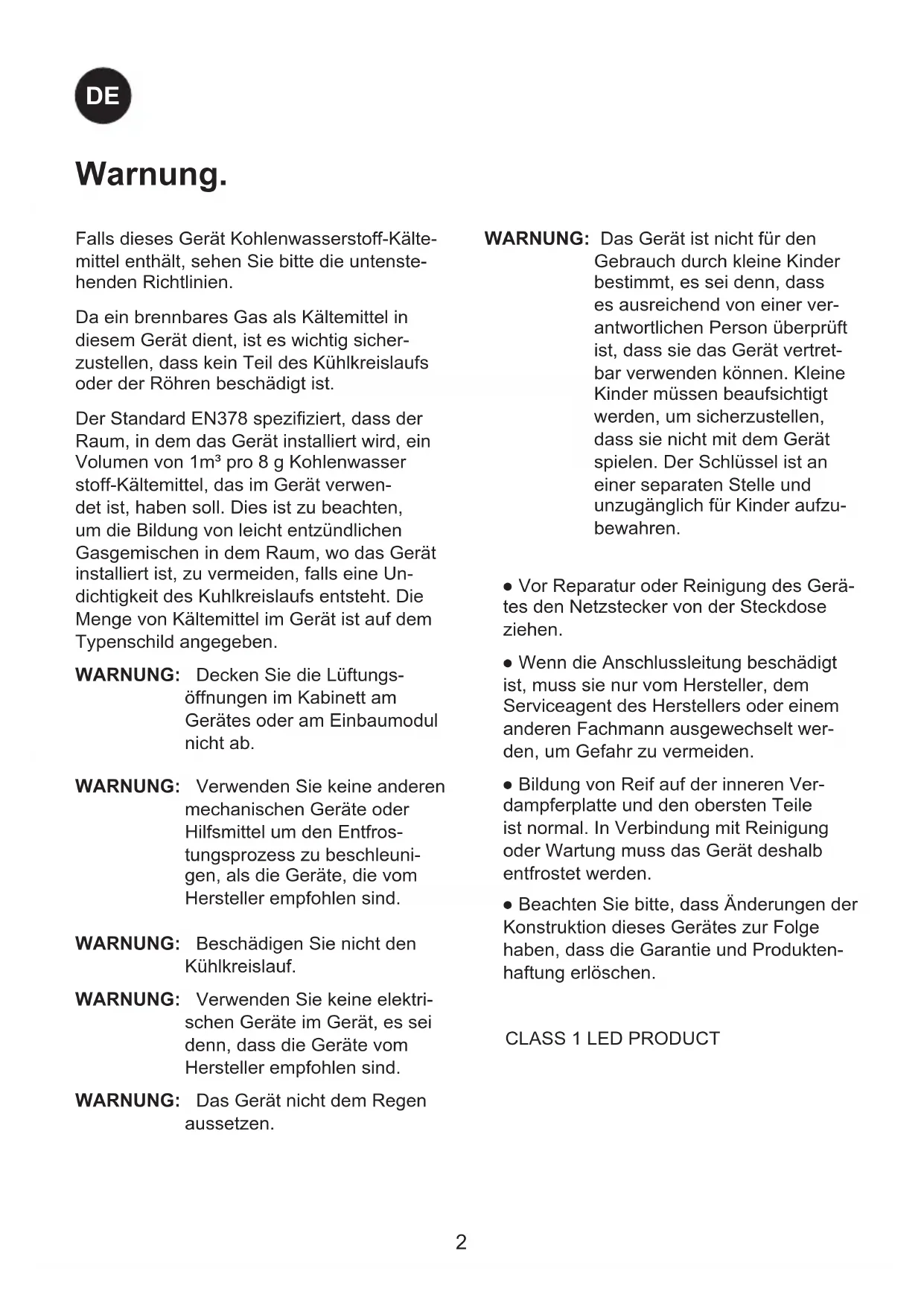 Falls dieses Gerät Kohlenwasserstoff-Kälte- mittel enthält, sehen Sie bitte die untenste- henden Richtlinien. Da ein brennbares Gas als Kältemittel in diesem Gerät dient, ist es wichtig sicher- zustellen, dass kein Teil des Kühlkreislaufs oder der Röhren beschädigt ist. Der Standard EN378 speziziert, dass der Raum, in dem das Gerät installiert wird, ein Volumen von 1m³ pro 8 g Kohlenwasser stoff-Kältemittel, das im Gerät verwen- det ist, haben soll. Dies ist zu beachten, um die Bildung von leicht entzündlichen Gasgemischen in dem Raum, wo das Gerät installiert ist, zu vermeiden, falls eine Un- dichtigkeit des Kuhlkreislaufs entsteht. Die Menge von Kältemittel im Gerät ist auf dem Typenschild angegeben. WARNUNG: Decken Sie die Lüftungs- öffnungen im Kabinett am Gerätes oder am Einbaumodul nicht ab. WARNUNG: Verwenden Sie keine anderen mechanischen Geräte oder Hilfsmittel um den Entfros- tungsprozess zu beschleuni- gen, als die Geräte, die vom Hersteller empfohlen sind. WARNUNG: Beschädigen Sie nicht den Kühlkreislauf. WARNUNG: Verwenden Sie keine elektri- schen Geräte im Gerät, es sei denn, dass die Geräte vom Hersteller empfohlen sind. WARNUNG: Das Gerät nicht dem Regen aussetzen. Warnung.3
