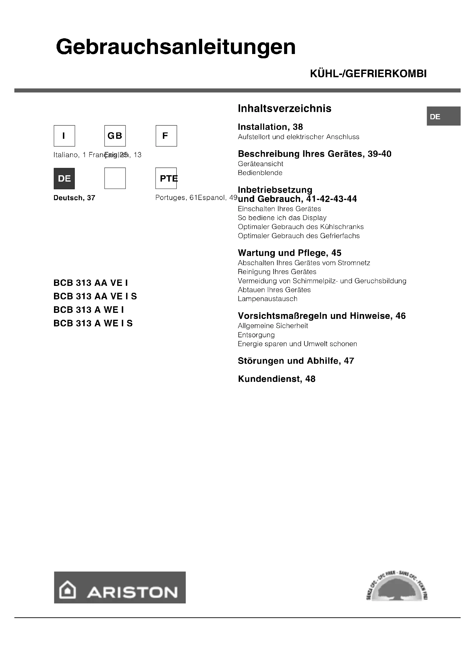 Inhaltsverzeichnis Installation, 38 Aufstellort und elektrischer Anschluss Beschreibung Ihres Gerätes, 39-40 Geräteansicht Bedienblende Inbetriebsetzung und Gebrauch, 41-42-43-44 Einschalten Ihres Gerätes So bediene ich das Display Optimaler Gebrauch des Kühlschranks Optimaler Gebrauch des Gefrierfachs Wartung und Pflege, 45 Abschalten Ihres Gerätes vom Stromnetz Reinigung Ihres Gerätes Vermeidung von Schimmelpilz- und Geruchsbildung Abtauen Ihres Gerätes Lampenaustausch Vorsichtsmaßregeln und Hinweise, 46 Allgemeine Sicherheit Entsorgung Energie sparen und Umwelt schonen Störungen und Abhilfe, 47 Kundendienst, 48 Gebrauchsanleitungen Italiano, 1 Français,25 Deutsch, 37 English, 13