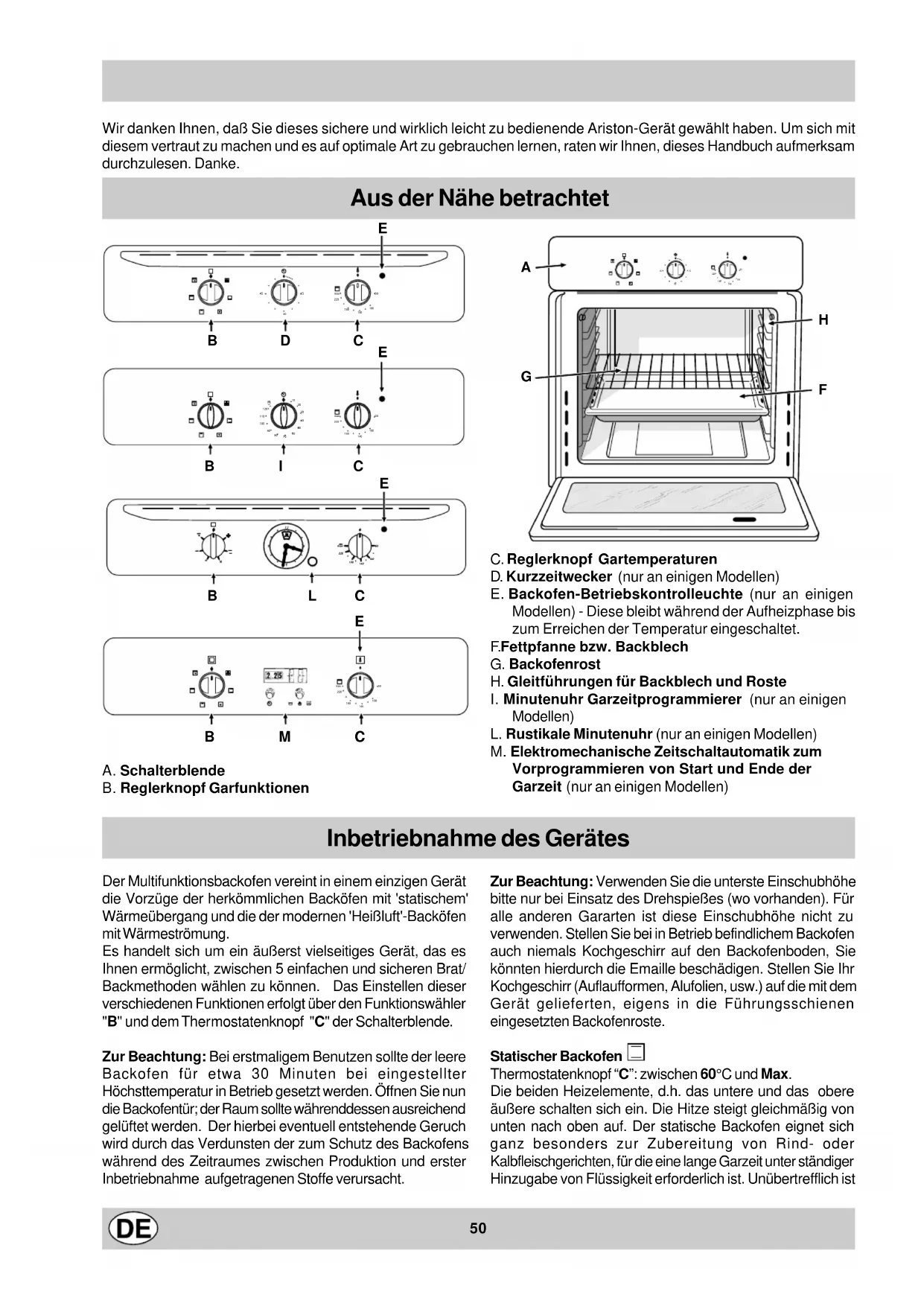 Inbetriebnahme des Gerätes Der Multifunktionsbackofen vereint in einem einzigen Gerät die Vorzüge der herkömmlichen Backöfen mit 'statischem' Wärmeübergang und die der modernen 'Heißluft'-Backöfen mit Wärmeströmung. Es handelt sich um ein äußerst vielseitiges Gerät, das es Ihnen ermöglicht, zwischen 5 einfachen und sicheren Brat/ Backmethoden wählen zu können. Das Einstellen dieser verschiedenen Funktionen erfolgt über den Funktionswähler "B" und dem Thermostatenknopf "C" der Schalterblende. Zur Beachtung: Bei erstmaligem Benutzen sollte der leere Backofen für etwa 30 Minuten bei eingestellter Höchsttemperatur in Betrieb gesetzt werden. Öffnen Sie nun die Backofentür; der Raum sollte währenddessen ausreichend gelüftet werden. Der hierbei eventuell entstehende Geruch wird durch das Verdunsten der zum Schutz des Backofens während des Zeitraumes zwischen Produktion und erster Inbetriebnahme aufgetragenen Stoffe verursacht. Zur Beachtung: Verwenden Sie die unterste Einschubhöhe bitte nur bei Einsatz des Drehspießes (wo vorhanden). Für alle anderen Gararten ist diese Einschubhöhe nicht zu verwenden. Stellen Sie bei in Betrieb befindlichem Backofen auch niemals Kochgeschirr auf den Backofenboden, Sie könnten hierdurch die Emaille beschädigen. Stellen Sie Ihr Kochgeschirr (Auflaufformen, Alufolien, usw.) auf die mit dem Gerät gelieferten, eigens in die Führungsschienen eingesetzten Backofenroste. Statischer Backofen Thermostatenknopf “C”: zwischen 60°C und Max. Die beiden Heizelemente, d.h. das untere und das obere äußere schalten sich ein. Die Hitze steigt gleichmäßig von unten nach oben auf. Der statische Backofen eignet sich ganz besonders zur Zubereitung von Rind- oder Kalbfleischgerichten, für die eine lange Garzeit unter ständiger Hinzugabe von Flüssigkeit erforderlich ist. Unübertrefflich ist