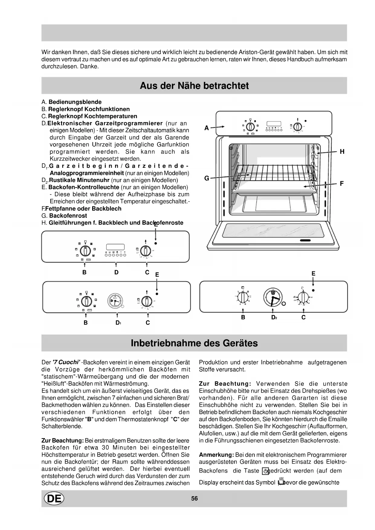 .Rustikale Minutenuhr (nur an einigen Modellen)E. Backofen-Kontrolleuchte (nur an einigen Modellen)- Diese bleibt während der Aufheizphase bis zumErreichen der eingestellten Temperatur eingeschaltet.-F. Fettpfanne oder BackblechG. BackofenrostH. Gleitführungen f. Backblech und Backofenroste Inbetriebnahme des Gerätes Der '7 Cuochi' -Backofen vereint in einem einzigen Gerätdie Vorzüge der herkömmlichen Backöfen mit"statischem"-Wärmeübergang und die der modernen"Heißluft"-Backöfen mit Wärmeströmung.Es handelt sich um ein äußerst vielseitiges Gerät, das esIhnen ermöglicht, zwischen 7 einfachen und sicheren Brat/Backmethoden wählen zu können. Das Einstellen dieserverschiedenen Funktionen erfolgt über den Funktionswähler "B" und dem Thermostatenknopf "C" der Schalterblende.Zur Beachtung: Bei erstmaligem Benutzen sollte der leereBackofen für etwa 30 Minuten bei eingestellterHöchsttemperatur in Betrieb gesetzt werden. Öffnen Sienun die Backofentür; der Raum sollte währenddessenausreichend gelüftet werden. Der hierbei eventuellentstehende Geruch wird durch das Verdunsten der zumSchutz des Backofens während des Zeitraumes zwischenProduktion und erster Inbetriebnahme aufgetragenenStoffe verursacht.Zur Beachtung: Verwenden Sie die untersteEinschubhöhe bitte nur bei Einsatz des Drehspießes (wovorhanden). Für alle anderen Gararten ist dieseEinschubhöhe nicht zu verwenden. Stellen Sie bei inBetrieb befindlichem Backofen auch niemals Kochgeschirrauf den Backofenboden, Sie könnten hierdurch die Emaillebeschädigen. Stellen Sie Ihr Kochgeschirr (Auflaufformen,Alufolien, usw.) auf die mit dem Gerät gelieferten, eigensin die Führungsschienen eingesetzten Backofenroste.Anmerkung: Bei den mit elektronischem Programmiererausgerüsteten Geräten muss bei Einsatz des Elektro-Backofens die Taste gedrückt werden (auf demDisplay erscheint das Symbol ), bevor die gewünschte