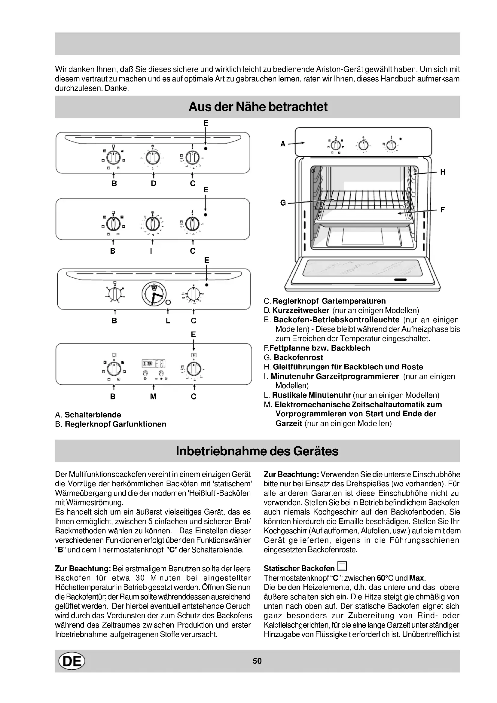 C. Reglerknopf Gartemperaturen D. Kurzzeitwecker (nur an einigen Modellen) E. Backofen-Betriebskontrolleuchte (nur an einigen Modellen) - Diese bleibt während der Aufheizphase bis zum Erreichen der Temperatur eingeschaltet. F. Fettpfanne bzw. Backblech G. Backofenrost H. Gleitführungen für Backblech und Roste