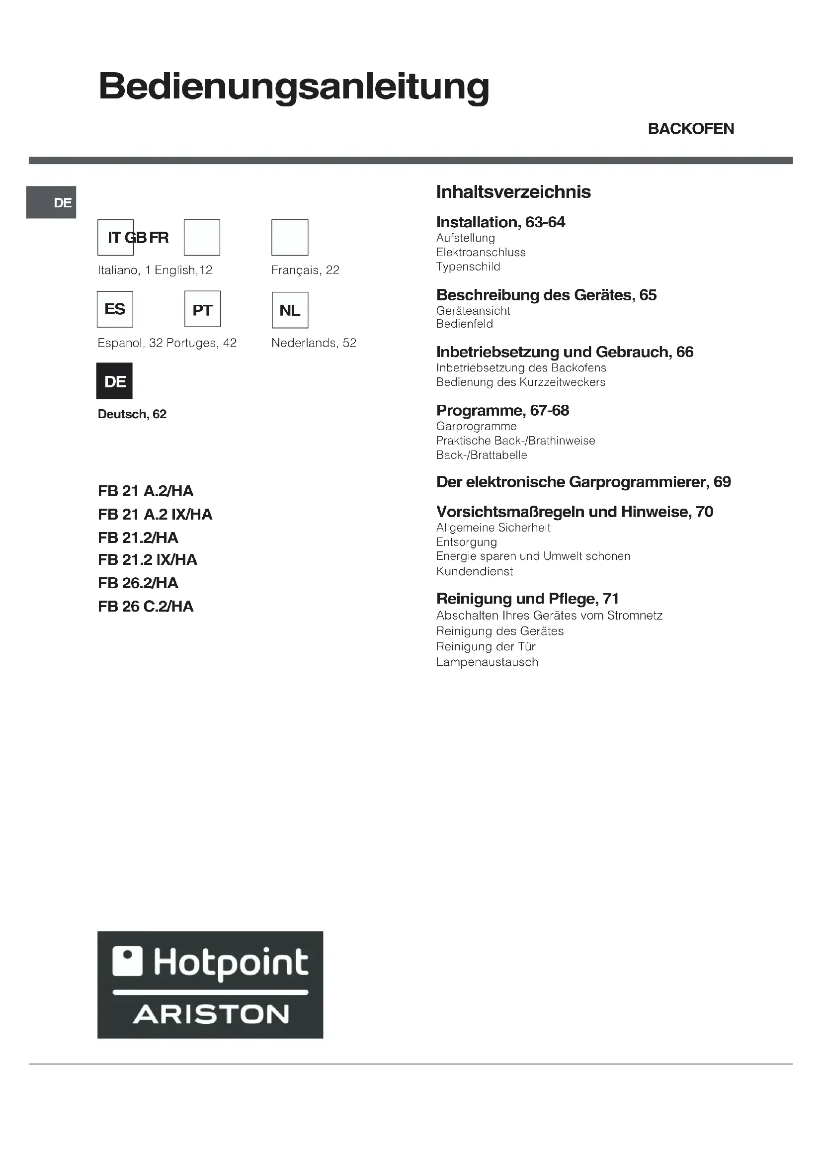 FB 21 A.2 IX/HA FB 21.2/HA FB 21.2 IX/HA FB 26.2/HA FB 26 C.2/HA Inhaltsverzeichnis Installation, 63-64 AufstellungElektroanschlussTypenschild Beschreibung des Gerätes, 65 GeräteansichtBedienfeld Inbetriebsetzung und Gebrauch, 66 Inbetriebsetzung des BackofensBedienung des Kurzzeitweckers Programme, 67-68 GarprogrammePraktische Back-/BrathinweiseBack-/Brattabelle Der elektronische Garprogrammierer, 69 Vorsichtsmaßregeln und Hinweise, 70 Allgemeine SicherheitEntsorgungEnergie sparen und Umwelt schonen Kundendienst Reinigung und Pflege, 71 Abschalten Ihres Gerätes vom Stromnetz Reinigung des Gerätes Reinigung der Tür Lampenaustausch Bedienungsanleitung BACKOFEN Français, 22 Espanol, 32 Portuges, 42 Deutsch, 62 Nederlands, 52