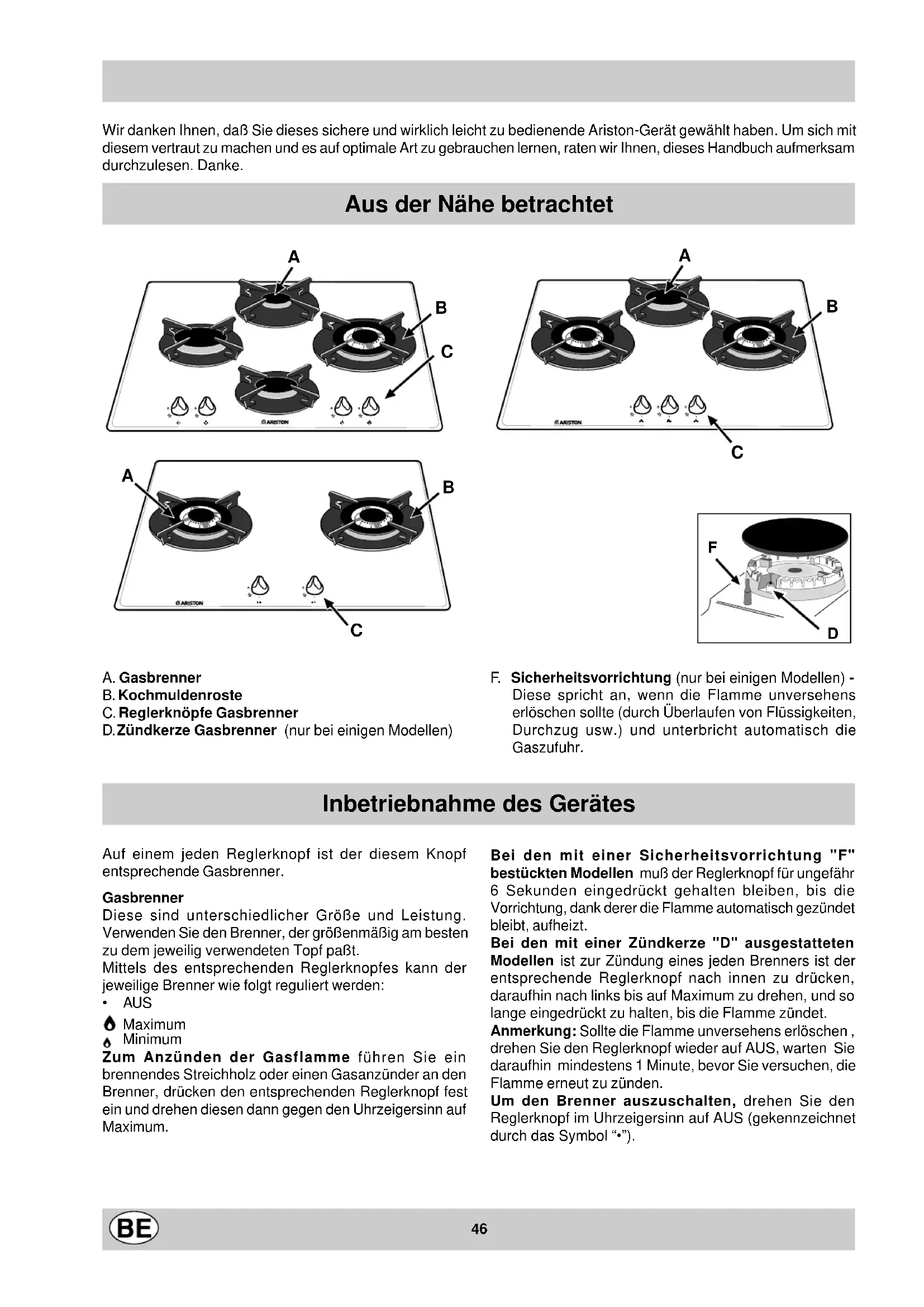 (1) Sòmente para os aparelhos com dispositivo de segurança contra fugas de gás (referência F). Este equipamento é conforme as seguintes normas comunitárias: - 73/23/CEE de 19.02.73 (baixa tensão) e modoficações sucessivas; - 89/336/CEE de 03/05/89 (compatibilidade electromagnética) e modificações sucessivas; - 90/396/CEE de 29/06/90 (Gaz) e modificações sucessivas; - 93/68/CEE de 22/07/93 e modificações sucessivas. TD 720... TD 730... TD 740... S46 Wir danken Ihnen, daß Sie dieses sichere und wirklich leicht zu bedienende Ariston-Gerät gewählt haben. Um sich mit diesem vertraut zu machen und es auf optimale Art zu gebrauchen lernen, raten wir Ihnen, dieses Handbuch aufmerksam durchzulesen. Danke. A. Gasbrenner B. Kochmuldenroste C. Reglerknöpfe Gasbrenner D. Zündkerze Gasbrenner (nur bei einigen Modellen) Aus der Nähe betrachtet Auf einem jeden Reglerknopf ist der diesem Knopf entsprechende Gasbrenner. Gasbrenner Diese sind unterschiedlicher Größe und Leistung. Verwenden Sie den Brenner, der größenmäßig am besten zu dem jeweilig verwendeten Topf paßt. Mittels des entsprechenden Reglerknopfes kann der jeweilige Brenner wie folgt reguliert werden: