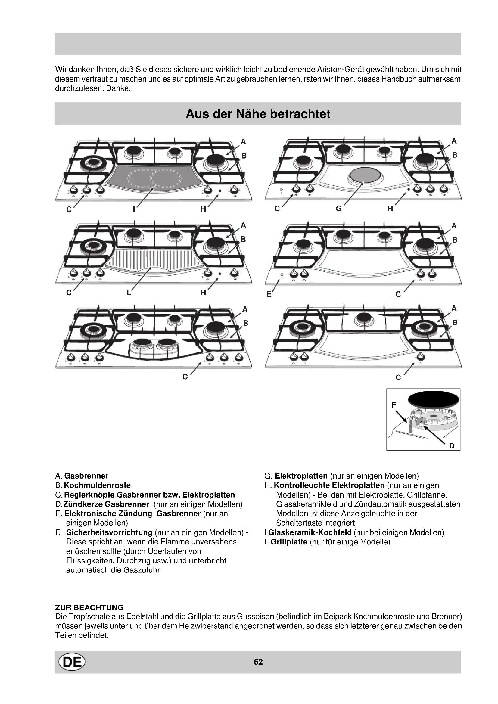 - Aus Maximum Minimum Zum Anzünden der Gasflamme führen Sie ein brennendes Streichholz oder einen Gasanzünder an den Brenner, drücken den entsprechenden Reglerknopf fest ein und drehen diesen dann gegen den Uhrzeigersinn auf Maximum. Bei den mit einer Sicherheitsvorrichtung "F" bestückten Modellen muß der Reglerknopf für ungefähr 6 Sekunden eingedrückt gehalten bleiben, bis die Vorrichtung, dank derer die Flamme automatisch gezündet bleibt, aufheizt. Bei den mit einer Zündkerze "D" ausgestatteten Modellen muß zur Zündung des gewählten Brenners zuerst die mit dem Symbol gekennzeichnete Zündungstaste “E” gedrückt, und dann der entsprechende Reglerknopf eingedrückt und im Gegenuhrzeigersinn bis auf Maximum gedreht werden. Einige Modelle sind mit einer in den Reglerknopf integrierten Zündvorrichtung ausgestattet, in diesem Fal- le ist das Modell mit der Zündkerze “D” bestückt, jedoch nicht mit der Zündungstaste “E” (das Symbol befindet sich demnach neben jedem Reglerknopf). Zur Zündung eines jeden Brenners ist der entsprechende Reglerknopf nach innen zu drücken, daraufhin nach links bis auf Maximum zu drehen, und so lange eingedrückt zu halten, bis die Flamme zündet. Hinweis: Sollte die Flamme unversehens erlöschen, drehen Sie den Reglerknopf wieder auf AUS, warten Sie daraufhin mindestens 1 Minute, bevor Sie versuchen, die Flamme erneut zu zünden. Um den Brenner auszuschalten, drehen Sie den Reglerknopf im Uhrzeigersinn wieder auf AUS (gekennzeichnet durch das Symbol “•”). Elektroplatten (nur an einigen Modellen) Hierbei kann es sich um Elektroplatten unterschiedlicher Größen und Leistungen handeln, d.h. um "Normal"- oder "Schnellkoch"-Elektroplatten, letztere sind durch einen roten Punkt in Plattenmitte gekennzeichnet. Durch Drehen nach rechts oder nach links können 6 verschiedene Einstellungsarten gewählt werden: 0 Aus 1 Niedrigste Leistung (Minimum) 2÷5 Mittlere Leistungen 6 Höchste Leistung (Maximum) Hinweise zum korrekten Gebrauch der Elektroplatten und den entsprechenden Reglerknopf-Einstellungen entnehmen Sie bitte dem Abschnitt "Praktische Hinweise zum Gebrauch der Elektroplatten". Bei jeder von AUS abweichenden Einstellung leuchtet die Kontrollampe "H". Grillplatte (nur für einige Modelle) Die 12 verschiedenen Stufen können jeweils durch Drehen des entsprechenden Schalterknopfes im Uhrzeigersinn oder gegen den Uhrzeigersinn eingestellt werden. 0 Ausgeschaltet 1 Niedrigste Stufe 2÷11 Mittlere Stufen 12 Höchste Stufe Bei jeder beliebigen Einstellung, abgesehen von der der Position 'AUS', schaltet sich die Betriebsanzeigeleuchte „H" ein. Glaskeramik (nur bei einigen Modellen) Diese Kochzone ist mit zwei unter der Glaszone angebrachten Heizstrahlerelementen ausgestattet. Es besteht die Möglichkeit, das kreisförmige Heizelement „A" allein einzuschalten, oder, falls eine größere Kochzone erforderlich ist, auch beide Elemente „A" und „B". Zum Einschalten der kreisförmigen Kochzone „A" drehen Sie den Schalterknopf im Uhrzeigersinn auf eine der 12 möglichen Einstellungen. Um auch die Kochzone „B" einzuschalten, drehen Sie den Schalterknopf auf Einstellung 12, und daraufhin eine Raste weiter auf Position , drehen Sie daraufhin den Knopf auf eine der 12 Leistungsstufen, diejenige, die Sie einstellen möchten, zurück. Der aufgedruckte Kreis kennzeichnet die Heizzone, die nach Einschalten glühend wird. A. Kreisförmige Kochzone; B. Vergrößerte Kochzone; C. Restwärmeanzeige: Diese zeigt an, dass die Kochzone, auch wenn sie bereits ausgeschaltet wurde, noch heiß ist, und eine Temperatur von als 60°C übersteigt.