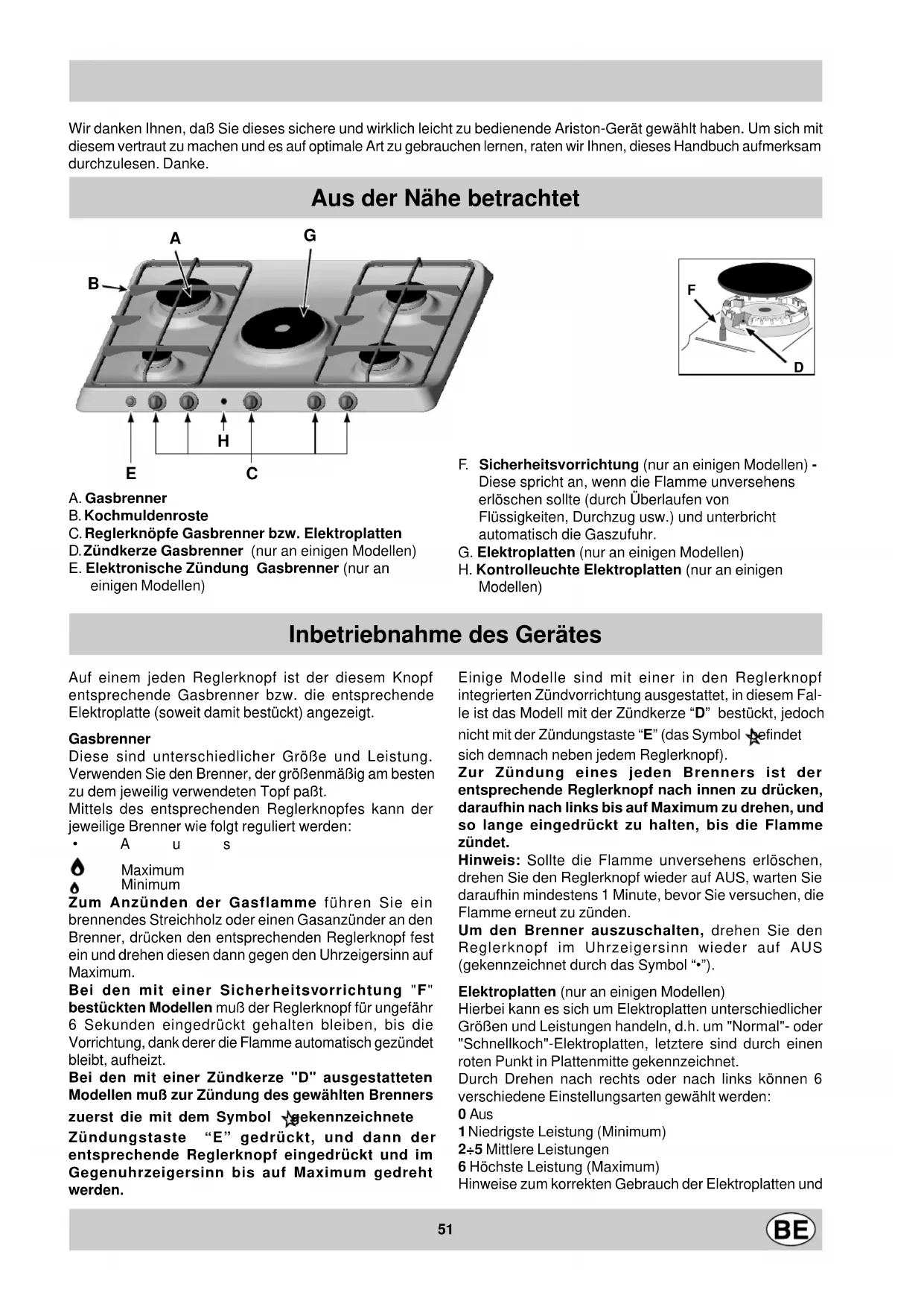 Wir danken Ihnen, daß Sie dieses sichere und wirklich leicht zu bedienende Ariston-Gerät gewählt haben. Um sich mit diesem vertraut zu machen und es auf optimale Art zu gebrauchen lernen, raten wir Ihnen, dieses Handbuch aufmerksam durchzulesen. Danke. A. Gasbrenner B. Kochmuldenroste C. Reglerknöpfe Gasbrenner bzw. Elektroplatten D. Zündkerze Gasbrenner (nur an einigen Modellen) E. Elektronische Zündung Gasbrenner (nur an einigen Modellen) Auf einem jeden Reglerknopf ist der diesem Knopf entsprechende Gasbrenner bzw. die entsprechende Elektroplatte (soweit damit bestückt) angezeigt. Gasbrenner Diese sind unterschiedlicher Größe und Leistung. Verwenden Sie den Brenner, der größenmäßig am besten zu dem jeweilig verwendeten Topf paßt. Mittels des entsprechenden Reglerknopfes kann der jeweilige Brenner wie folgt reguliert werden: