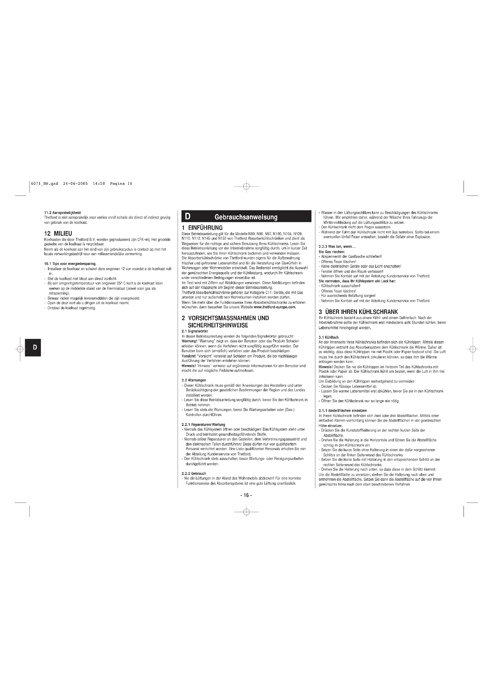11.2 AansprakelijkheidThetford is niet aansprakelijk voor verlies en/of schade als direct of indirect gevolgvan gebruik van de koelkast. 12 MILIEU Koelkasten die door Thetford B.V. worden geproduceerd zijn CFK-vrij. Het grootstegedeelte van de koelkast is recyclebaar.Neem als de koelkast aan het eind van zijn gebruikscyclus is contact op met hetlocale verwerkingsbedrijf voor een milieuvriendelijke verwerking.10.1 Tips voor energiebesparing- Installeer de koelkast en schakel deze ongeveer 12 uur voordat u de koelkast vult in. - Stel de koelkast niet bloot aan direct zonlicht.- Bij een omgevingstemperatuur van ongeveer 25° C kunt u de koelkast latenwerken op de middelste stand van de thermostaat (zowel voor gas alsnetspanning).- Bewaar indien mogelijk levensmiddelen die zijn voorgekoeld.- Open de deur kort als u dingen uit de koelkast neemt.- Ontdooi de koelkast regelmatig. 1 EINFÜHRUNG Diese Betriebsanleitung gilt für die Modelle N80, N90, N97, N100, N104, N109,N110, N112, N145 und N150 von Thetford Absorberkühlschränken und dient alsWegweiser für die richtige und sichere Benutzung Ihres Kühlschranks. Lesen Siediese Betriebsanleitung vor der Inbetriebnahme sorgfältig durch, um in kurzer Zeitherauszufinden, wie Sie Ihren Kühlschrank bedienen und verwenden müssen.Die Absorberkühlschränke von Thetford wurden eigens für die Aufbewahrungfrischer und gefrorener Lebensmittel und für die Herstellung von Eiswürfeln inWohnwagen oder Wohnmobilen entwickelt. Das Bedienteil ermöglicht die Auswahlder gewünschten Energiequelle und der Kühlleistung, wodurch Ihr Kühlschrankunter verschiedenen Bedingungen einsetzbar ist.Im Text wird mit Ziffern auf Abbildungen verwiesen. Diese Abbildungen befindensich auf der Klappkarte am Beginn dieser Betriebsanleitung.Thetford Absorberkühlschränke gehören zur Kategorie C11: Geräte, die mit Gasarbeiten und nur außerhalb von Wohnräumen installiert werden dürfen.Wenn Sie mehr über die Funktionsweise Ihres Absorberkühlschranks zu erfahren wünschen, dann besuchen Sie unsere Website www.thetford-europe.com. 2 VORSICHTSMASSNAHMEN UND SICHERHEITSHINWEISE
