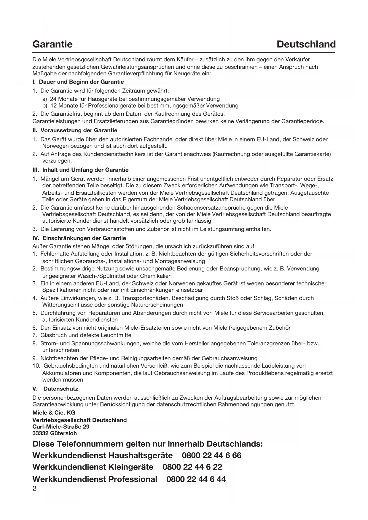 Die personenbezogenen Daten werden ausschließlich zu Zwecken der Auftragsbearbeitung sowie zur möglichen Garantieabwicklung unter Berücksichtigung der datenschutzrechtlichen Rahmenbedingungen genutzt. Miele & Cie. KG Vertriebsgesellschaft Deutschland Carl-Miele-Straße 29 33332 Gütersloh Diese Telefonnummern gelten nur innerhalb Deutschlands: Werkkundendienst Haushaltsgeräte 0800 22 44 6 66 Werkkundendienst Kleingeräte 0800 22 44 6 22 Werkkundendienst Professional 0800 22 44 6 443 Wasserschutzgarantiebedingungen Deutschland Miele räumt dem Käufer – zusätzlich zu den ihm gegen den Verkäufer und Miele zustehenden gesetzlichen und vertraglichen Rechten und ohne diese zu beschränken –unentgeltlich einen Anspruch nach Maßgabe der nachfolgenden Wasserschutzgarantiebedingungen für neue Hausgeräte mit Wasserschutzsystem (nachfolgend: „Gerät/e“) ein: