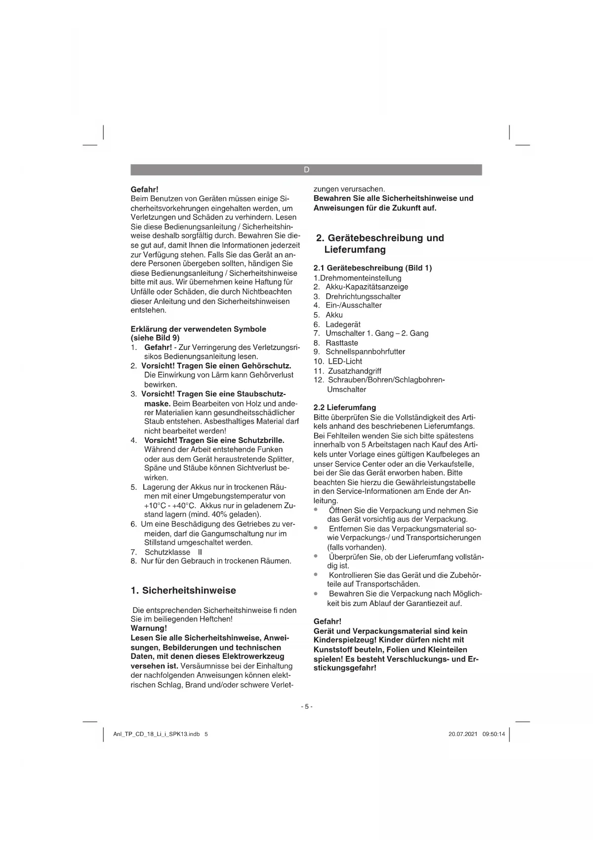 Bewahren Sie die Verpackung nach Möglich- keit bis zum Ablauf der Garantiezeit auf. Gefahr! Gerät und Verpackungsmaterial sind kein Kinderspielzeug! Kinder dürfen nicht mit Kunststoff beuteln, Folien und Kleinteilen spielen! Es besteht Verschluckungs- und Er- stickungsgefahr! Anl_TP_CD_18_Li_i_SPK13.indb 5Anl_TP_CD_18_Li_i_SPK13.indb 5 20.07.2021 09:50:1420.07.2021 09:50:14D
