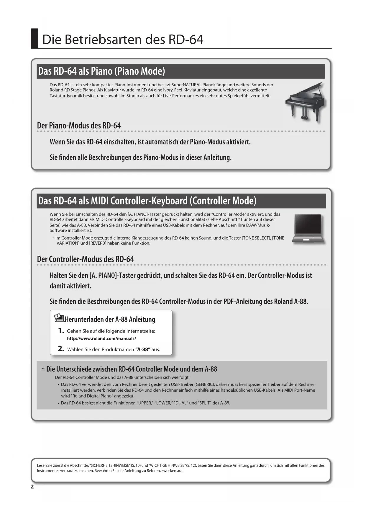 - In the interest of product improvement, the specications and/or appearance of this unit are subject to change without prior notice. Copyright © 2013 ROLAND CORPORATION All rights reserved. No part of this publication may be reproduced in any form without the written permission of ROLAND CORPORATION.Digital Piano Bedienungsanleitung Deutsch Français Italiano Español Português NederlandsEnglish2 Das RD-64 als Piano (Piano Mode) Das RD-64 ist ein sehr kompaktes Piano-Instrument und besitzt SuperNATURAL Pianoklänge und weitere Sounds der Roland RD Stage Pianos. Als Klaviatur wurde im RD-64 eine Ivory-Feel-Klaviatur eingebaut, welche eine exzellente Tastaturdynamik besitzt und sowohl im Studio als auch für Live-Performances ein sehr gutes Spielgefühl vermittelt. Der Piano-Modus des RD-64 Wenn Sie das RD-64 einschalten, ist automatisch der Piano-Modus aktiviert. Sie nden alle Beschreibungen des Piano-Modus in dieser Anleitung. Das RD-64 als MIDI Controller-Keyboard (Controller Mode) Wenn Sie bei Einschalten des RD-64 den [A. PIANO]-Taster gedrückt halten, wird der “Controller Mode” aktiviert, und das RD-64 arbeitet dann als MIDI Controller-Keyboard mit der gleichen Funktionalität (siehe Abschnitt *1 unten auf dieser Seite) wie das A-88. Verbinden Sie das RD-64 mithilfe eines USB-Kabels mit dem Rechner, auf dem Ihre DAW/Musik-Software installiert ist. * Im Controller Mode erzeugt die interne Klangerzeugung des RD-64 keinen Sound, und die Taster [TONE SELECT], [TONE VARIATION] und [REVERB] haben keine Funktion. Der Controller-Modus des RD-64 Halten Sie den [A. PIANO]-Taster gedrückt, und schalten Sie das RD-64 ein. Der Controller-Modus ist damit aktiviert. Sie nden die Beschreibungen des RD-64 Controller-Modus in der PDF-Anleitung des Roland A-88. Herunterladen der A-88 Anleitung
