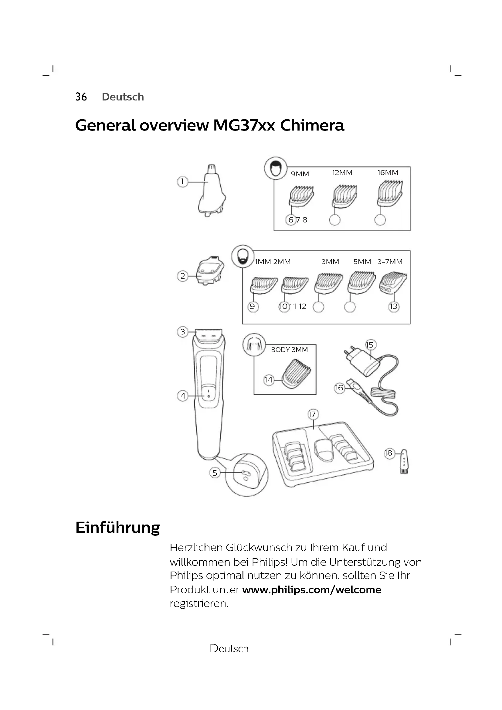 DeutschAllgemeine Beschreibung (Abb. 1) 1 Nasenhaartrimmer (nur MG3710, MG3711, MG3712, MG3721, MG3720, MG3730, MG3731, MG3740, MG3747, MG3748, MG3757) 2 Präzisionstrimmer (nur MG3740, MG3757) 3 Full Size-Haartrimmer 4 Ein-/Ausschalter 5 Buchse für Gerätestecker 6 Haar-Kammaufsatz (9mm) (nur MG3720, MG3721, MG3730, MG3731, MG3740, MG3747, MG3748, MG3757) 7 Haar-Kammaufsatz (12 mm) (nur MG3730, MG3740, MG3747, MG3757, MG3731, MG3748) 8 Haar-Kammaufsatz (16 mm) (nur MG3730, MG3740, MG3747, MG3757, MG3731, MG3748) 9 Stoppel-Kammaufsatz (1 mm) (nur MG3710, MG3711, MG3712, MG3720, MG3721, MG3730, MG3731, MG3740, MG3747, MG3748, MG3757) 10 Stoppel-Kammaufsatz (2 mm) (nur MG3710, MG3711, MG3720, MG3721, MG3730, MG3731, MG3740, MG3747, MG3748, MG3757) 11 Stoppel-Kammaufsatz 3 mm (nur MG3710, MG3711, MG3712, MG3720, MG3721) 12 Stoppel-Kammaufsatz 5 mm (nur MG3710, MG3711, MG3712, MG3720, MG3721) 13 Verstellbarer Kammaufsatz (3-7mm) (nur MG3730, MG3731, MG3740, MG3747, MG3748, MG3757) 14 Körperhaar-Kammaufsatz (3 mm) (nur MG3747, MG3748) 15 Stromversorgungseinheit 16 Gerätestecker 17 Speicheranzeige (nur MG3711, MG3712, MG3721, MG3731, MG3748) 18 Reinigungsbürste Das mitgelieferte Zubehör kann für verschiedene Produkte variieren. Die Verpackung zeigt das Zubehör, das mit Ihrem Gerät mitgeliefert wurde.