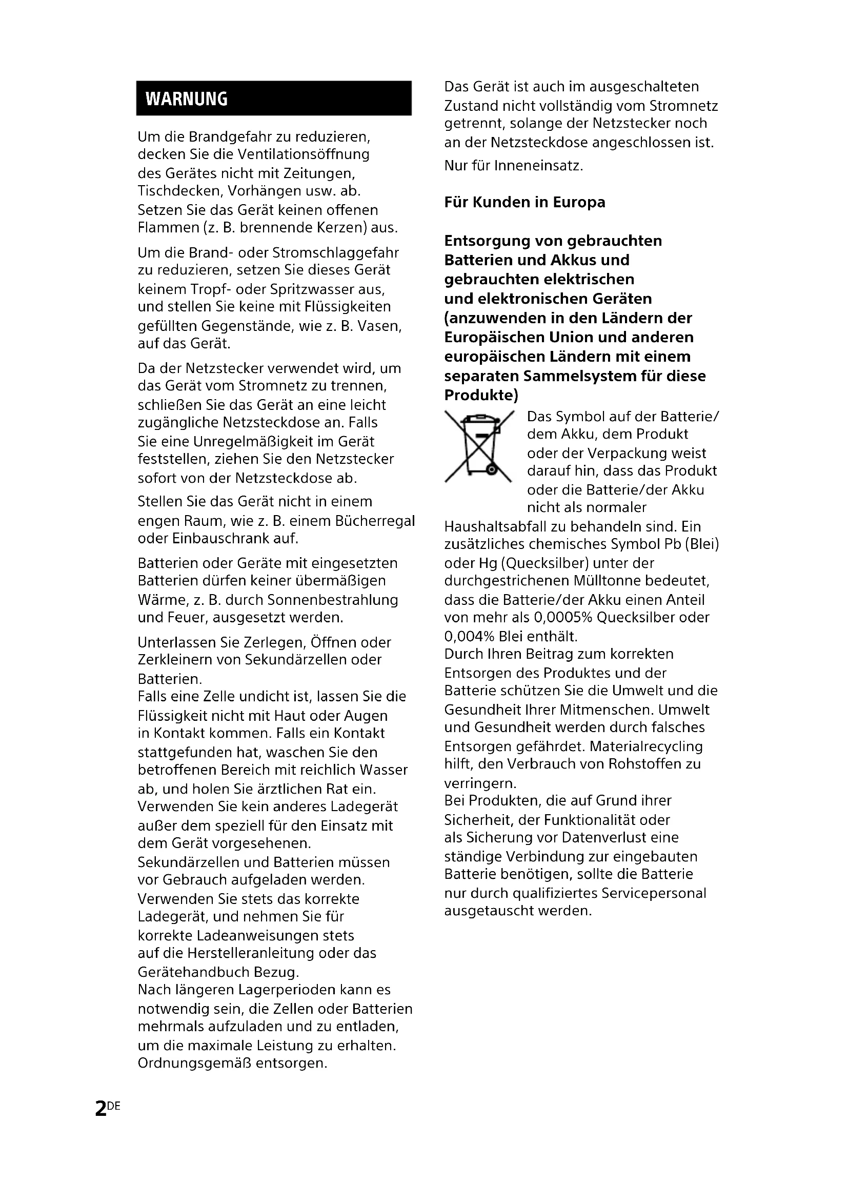 GTK-XB60/XB90.4-697-227-32(1) WARNUNG Um die Brandgefahr zu reduzieren, decken Sie die Ventilationsöffnung des Gerätes nicht mit Zeitungen, Tischdecken, Vorhängen usw. ab. Setzen Sie das Gerät keinen offenen Flammen (z. B. brennende Kerzen) aus. Um die Brand- oder Stromschlaggefahr zu reduzieren, setzen Sie dieses Gerät keinem Tropf- oder Spritzwasser aus, und stellen Sie keine mit Flüssigkeiten gefüllten Gegenstände, wie z. B. Vasen, auf das Gerät. Da der Netzstecker verwendet wird, um das Gerät vom Stromnetz zu trennen, schließen Sie das Gerät an eine leicht zugängliche Netzsteckdose an. Falls Sie eine Unregelmäßigkeit im Gerät feststellen, ziehen Sie den Netzstecker sofort von der Netzsteckdose ab. Stellen Sie das Gerät nicht in einem engen Raum, wie z. B. einem Bücherregal oder Einbauschrank auf. Batterien oder Geräte mit eingesetzten Batterien dürfen keiner übermäßigen Wärme, z. B. durch Sonnenbestrahlung und Feuer, ausgesetzt werden. Unterlassen Sie Zerlegen, Öffnen oder Zerkleinern von Sekundärzellen oder Batterien. Falls eine Zelle undicht ist, lassen Sie die Flüssigkeit nicht mit Haut oder Augen in Kontakt kommen. Falls ein Kontakt stattgefunden hat, waschen Sie den betroffenen Bereich mit reichlich Wasser ab, und holen Sie ärztlichen Rat ein. Verwenden Sie kein anderes Ladegerät außer dem speziell für den Einsatz mit dem Gerät vorgesehenen. Sekundärzellen und Batterien müssen vor Gebrauch aufgeladen werden. Verwenden Sie stets das korrekte Ladegerät, und nehmen Sie für korrekte Ladeanweisungen stets auf die Herstelleranleitung oder das Gerätehandbuch Bezug. Nach längeren Lagerperioden kann es notwendig sein, die Zellen oder Batterien mehrmals aufzuladen und zu entladen, um die maximale Leistung zu erhalten. Ordnungsgemäß entsorgen. Das Gerät ist auch im ausgeschalteten Zustand nicht vollständig vom Stromnetz getrennt, solange der Netzstecker noch an der Netzsteckdose angeschlossen ist. Nur für Inneneinsatz. Für Kunden in Europa Entsorgung von gebrauchten Batterien und Akkus und gebrauchten elektrischen und elektronischen Geräten (anzuwenden in den Ländern der Europäischen Union und anderen europäischen Ländern mit einem separaten Sammelsystem für diese Produkte) Das Symbol auf der Batterie/ dem Akku, dem Produkt oder der Verpackung weist darauf hin, dass das Produkt oder die Batterie/der Akku nicht als normaler Haushaltsabfall zu behandeln sind. Ein zusätzliches chemisches Symbol Pb (Blei) oder Hg (Quecksilber) unter der durchgestrichenen Mülltonne bedeutet, dass die Batterie/der Akku einen Anteil von mehr als 0,0005% Quecksilber oder 0,004% Blei enthält. Durch Ihren Beitrag zum korrekten Entsorgen des Produktes und der Batterie schützen Sie die Umwelt und die Gesundheit Ihrer Mitmenschen. Umwelt und Gesundheit werden durch falsches Entsorgen gefährdet. Materialrecycling hilft, den Verbrauch von Rohstoffen zu verringern. Bei Produkten, die auf Grund ihrer Sicherheit, der Funktionalität oder als Sicherung vor Datenverlust eine ständige Verbindung zur eingebauten Batterie benötigen, sollte die Batterie nur durch qualifiziertes Servicepersonal ausgetauscht werden.3