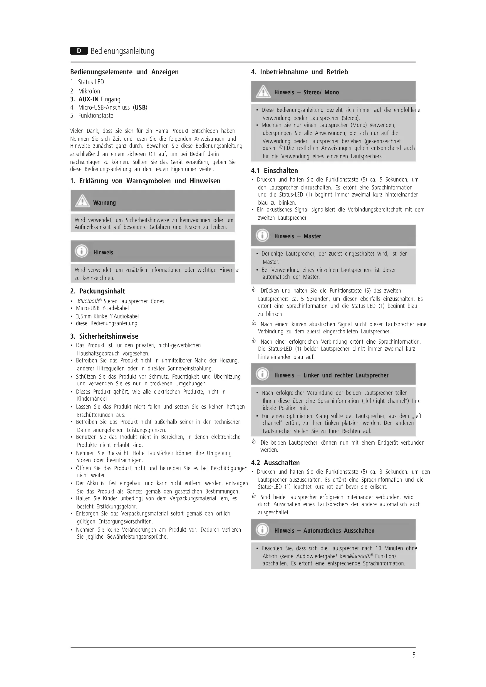 - Drücken und halten Sie die Funktionstaste (5) ca. 5 Sekunden, umden Lautsprecher einzuschalten. Es ertönt eine Sprachinformationund die Status-LED (1) beginnt immer zweimal kurz hintereinanderblau zu blinken.• Ein akustisches Signal signalisiert die Verbindungsbereitschaft mit demzweiten Lautsprecher.Hinweis – Master• Derjenige Lautsprecher, der zuerst eingeschaltet wird, ist derMaster.• Bei Verwendung eines einzelnen Lautsprechers ist dieserautomatisch der Master. C Drücken und halten Sie die Funktionstaste (5) des zweiten Lautsprechers ca. 5 Sekunden, um diesen ebenfalls einzuschalten. Esertönt eine Sprachinformation und die Status-LED (1) beginnt blauzu blinken. C Nach einem kurzen akustischen Signal sucht dieser Lautsprecher eine Verbindung zu dem zuerst eingeschalteten Lautsprecher. C Nach einer erfolgreichen Verbindung ertönt eine Sprachinformation. Die Status-LED (1) beider Lautsprecher blinkt immer zweimal kurzhintereinander blau auf.Hinweis – Linker und rechter Lautsprecher• Nach erfolgreicher Verbindung der beiden Lautsprecher teilenIhnen diese über eine Sprachinformation („left/right channel“) Ihreideale Position mit.• Für einen optimierten Klang sollte der Lautsprecher, aus dem „leftchannel“ ertönt, zu Ihrer Linken platziert werden. Den anderenLautsprecher stellen Sie zu Ihrer Rechten auf. C Die beiden Lautsprecher können nun mit einem Endgerät verbunden werden.