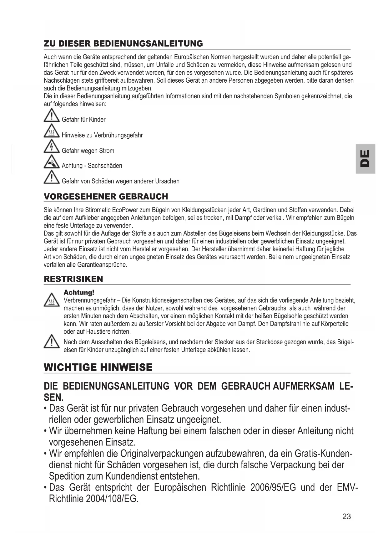Auch wenn die Geräte entsprechend der geltenden Europäischen Normen hergestellt wurden und daher alle potentiell ge- fährlichen Teile geschützt sind, müssen, um Unfälle und Schäden zu vermeiden, diese Hinweise aufmerksam gelesen und das Gerät nur für den Zweck verwendet werden, für den es vorgesehen wurde. Die Bedienungsanleitung auch für späteres Nachschlagen stets griffbereit aufbewahren. Soll dieses Gerät an andere Personen abgegeben werden, bitte daran denken auch die Bedienungsanleitung mitzugeben. Die in dieser Bedienungsanleitung aufgeführten Informationen sind mit den nachstehenden Symbolen gekennzeichnet, die auf folgendes hinweisen: Gefahr für Kinder Hinweise zu Verbrühungsgefahr Gefahr wegen Strom Achtung - Sachschäden Gefahr von Schäden wegen anderer Ursachen VORGESEHENER GEBRAUCH Sie können Ihre Stiromatic EcoPower zum Bügeln von Kleidungsstücken jeder Art, Gardinen und Stoffen verwenden. Dabei die auf dem Aufkleber angegeben Anleitungen befolgen, sei es trocken, mit Dampf oder verikal. Wir empfehlen zum Bügeln eine feste Unterlage zu verwenden. Das gilt sowohl für die Auage der Stoffe als auch zum Abstellen des Bügeleisens beim Wechseln der Kleidungsstücke. Das Gerät ist für nur privaten Gebrauch vorgesehen und daher für einen industriellen oder gewerblichen Einsatz ungeeignet. Jeder andere Einsatz ist nicht vom Hersteller vorgesehen. Der Hersteller übernimmt daher keinerlei Haftung für jegliche Art von Schäden, die durch einen ungeeigneten Einsatz des Gerätes verursacht werden. Bei einem ungeeigneten Einsatz verfallen alle Garantieansprüche. RESTRISIKEN Achtung! Verbrennungsgefahr – Die Konstruktionseigenschaften des Gerätes, auf das sich die vorliegende Anleitung bezieht, machen es unmöglich, dass der Nutzer, sowohl während des vorgesehenen Gebrauchs als auch während der ersten Minuten nach dem Abschalten, vor einem möglichen Kontakt mit der heißen Bügelsohle geschützt werden kann. Wir raten außerdem zu äußerster Vorsicht bei der Abgabe von Dampf. Den Dampfstrahl nie auf Körperteile oder auf Haustiere richten. Nach dem Ausschalten des Bügeleisens, und nachdem der Stecker aus der Steckdose gezogen wurde, das Bügel- eisen für Kinder unzugänglich auf einer festen Unterlage abkühlen lassen. WICHTIGE HINWEISE DIE BEDIENUNGSANLEITUNG VOR DEM GEBRAUCH AUFMERKSAM LE- SEN.