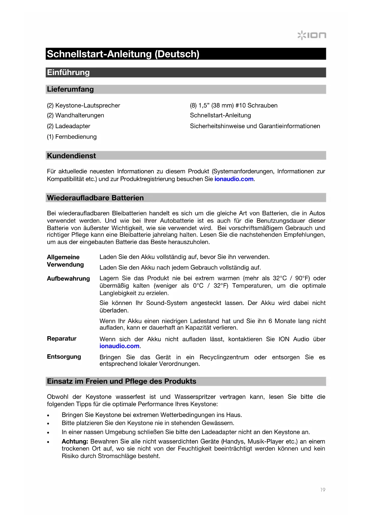 Schnellstart-Anleitung (Deutsch) Einführung Lieferumfang (2) Keystone-Lautsprecher (2) Wandhalterungen (2) Ladeadapter (1) Fernbedienung (8) 1,5” (38 mm) #10 Schrauben Schnellstart-Anleitung Sicherheitshinweise und Garantieinformationen Kundendienst Für aktuelledie neuesten Informationen zu diesem Produkt (Systemanforderungen, Informationen zur Kompatibilität etc.) und zur Produktregistrierung besuchen Sie ionaudio.com. Wiederaufladbare Batterien Bei wiederaufladbaren Bleibatterien handelt es sich um die gleiche Art von Batterien, die in Autos verwendet werden. Und wie bei Ihrer Autobatterie ist es auch für die Benutzungsdauer dieser Batterie von äußerster Wichtigkeit, wie sie verwendet wird. Bei vorschriftsmäßigem Gebrauch und richtiger Pflege kann eine Bleibatterie jahrelang halten. Lesen Sie die nachstehenden Empfehlungen, um aus der eingebauten Batterie das Beste herauszuholen. Allgemeine Verwendung Laden Sie den Akku vollständig auf, bevor Sie ihn verwenden. Laden Sie den Akku nach jedem Gebrauch vollständig auf. Aufbewahrung Lagern Sie das Produkt nie bei extrem warmen (mehr als 32°C / 90°F) oder übermäßig kalten (weniger als 0°C / 32°F) Temperaturen, um die optimale Langlebigkeit zu erzielen. Sie können Ihr Sound-System angesteckt lassen. Der Akku wird dabei nicht überladen. Wenn Ihr Akku einen niedrigen Ladestand hat und Sie ihn 6 Monate lang nicht aufladen, kann er dauerhaft an Kapazität verlieren. Reparatur Wenn sich der Akku nicht aufladen lässt, kontaktieren Sie ION Audio über ionaudio.com. Entsorgung Bringen Sie das Gerät in ein Recyclingzentrum oder entsorgen Sie es entsprechend lokaler Verordnungen. Einsatz im Freien und Pflege des Produkts Obwohl der Keystone wasserfest ist und Wasserspritzer vertragen kann, lesen Sie bitte die folgenden Tipps für die optimale Performance Ihres Keystone: