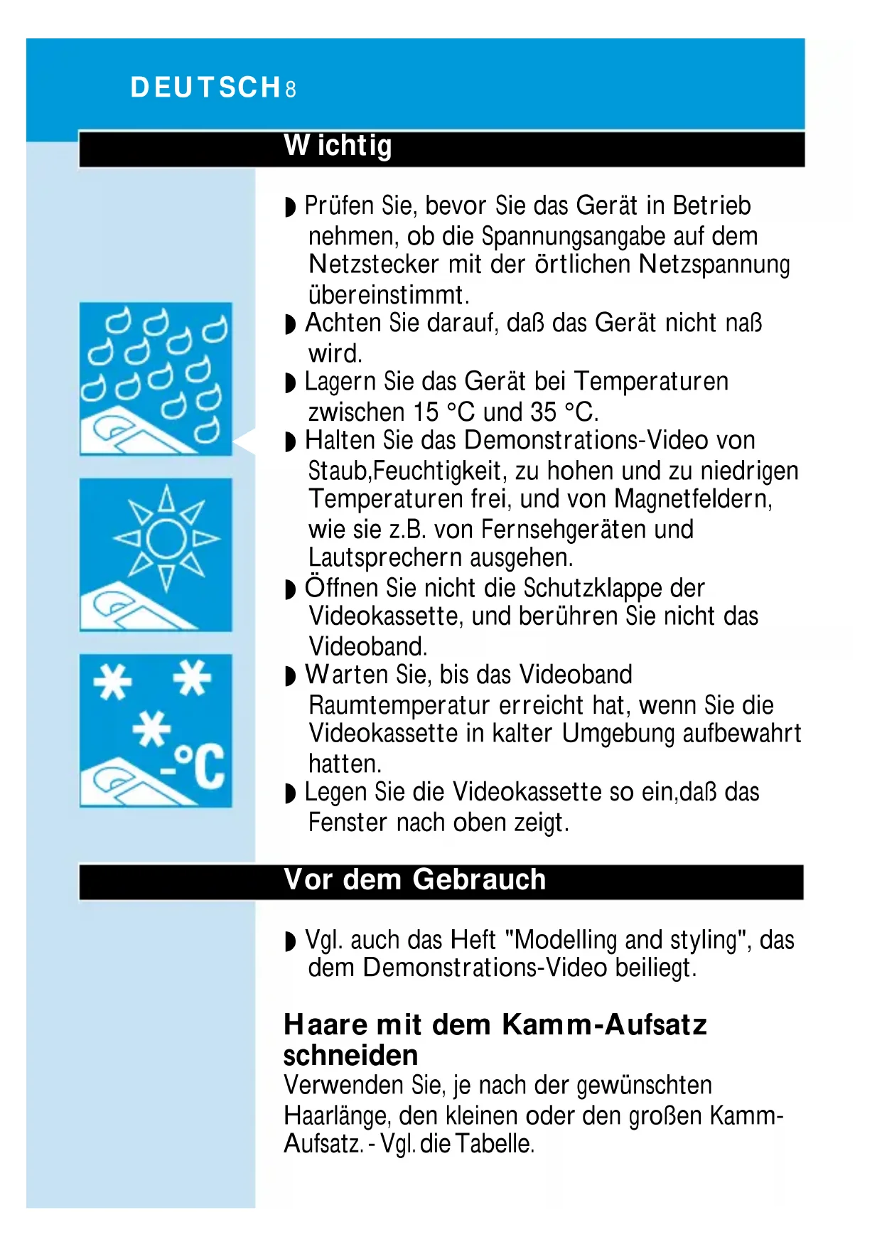 Verwenden Sie, je nach der gewünschten Haarlänge, den kleinen oder den größten Kamm-Aufsatz. - Vgl. die Tabelle.
