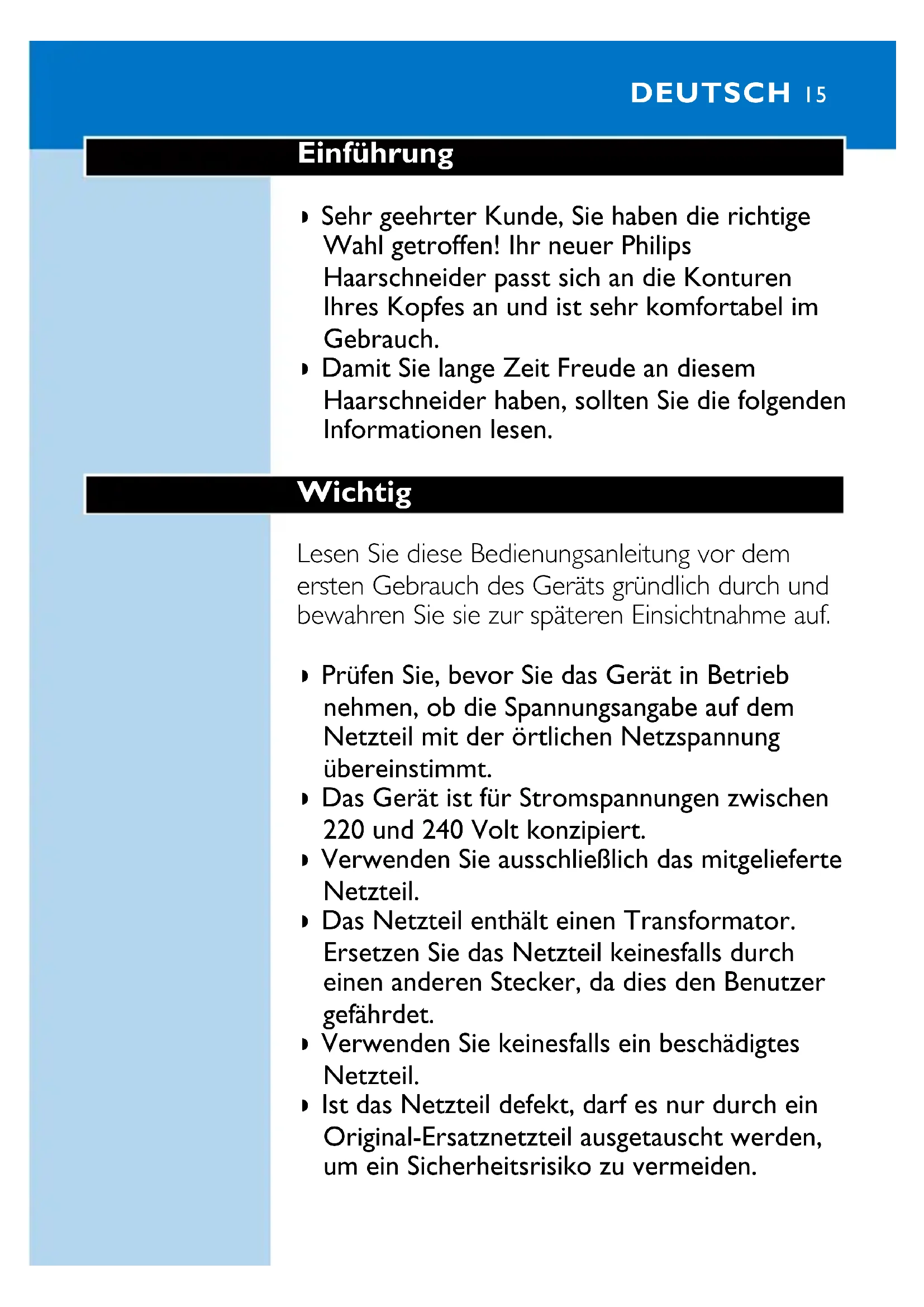 6 Pull the battery out of the appliance. Dispose of the battery and the other components in an environmentally safe way. Do not connect the appliance to the mains again after the battery has been removed! ENGLISH 13Guarantee & service If you need information or if you have a problem, please visit the Philips website at www.philips.com or contact the Philips Customer Care Centre in your country (you will find its phone number in the worldwide guarantee leaflet). If there is no Customer Care Centre in your country, turn to your local Philips dealer or contact the Service Department of Philips Domestic Appliances and Personal Care BV. ENGLISH14Einführung ◗ Sehr geehrter Kunde, Sie haben die richtige Wahl getroffen! Ihr neuer Philips Haarschneider passt sich an die Konturen Ihres Kopfes an und ist sehr komfortabel im Gebrauch. ◗ Damit Sie lange Zeit Freude an diesem Haarschneider haben, sollten Sie die folgenden Informationen lesen. Wichtig Lesen Sie diese Bedienungsanleitung vor dem ersten Gebrauch des Geräts gründlich durch und bewahren Sie sie zur späteren Einsichtnahme auf. ◗ Prüfen Sie, bevor Sie das Gerät in Betrieb nehmen, ob die Spannungsangabe auf dem Netzteil mit der örtlichen Netzspannung übereinstimmt. ◗ Das Gerät ist für Stromspannungen zwischen 220 und 240 Volt konzipiert. ◗ Verwenden Sie ausschließlich das mitgelieferte Netzteil. ◗ Das Netzteil enthält einen Transformator. Ersetzen Sie das Netzteil keinesfalls durch einen anderen Stecker, da dies den Benutzer gefährdet. ◗ Verwenden Sie keinesfalls ein beschädigtes Netzteil. ◗ Ist das Netzteil defekt, darf es nur durch ein Original-Ersatznetzteil ausgetauscht werden, um ein Sicherheitsrisiko zu vermeiden. DEUTSCH 15C ◗ Achten Sie darauf, dass Gerät und Netzteil nicht nass werden. ◗ Halten Sie das Gerät außer der Reichweite von Kindern.