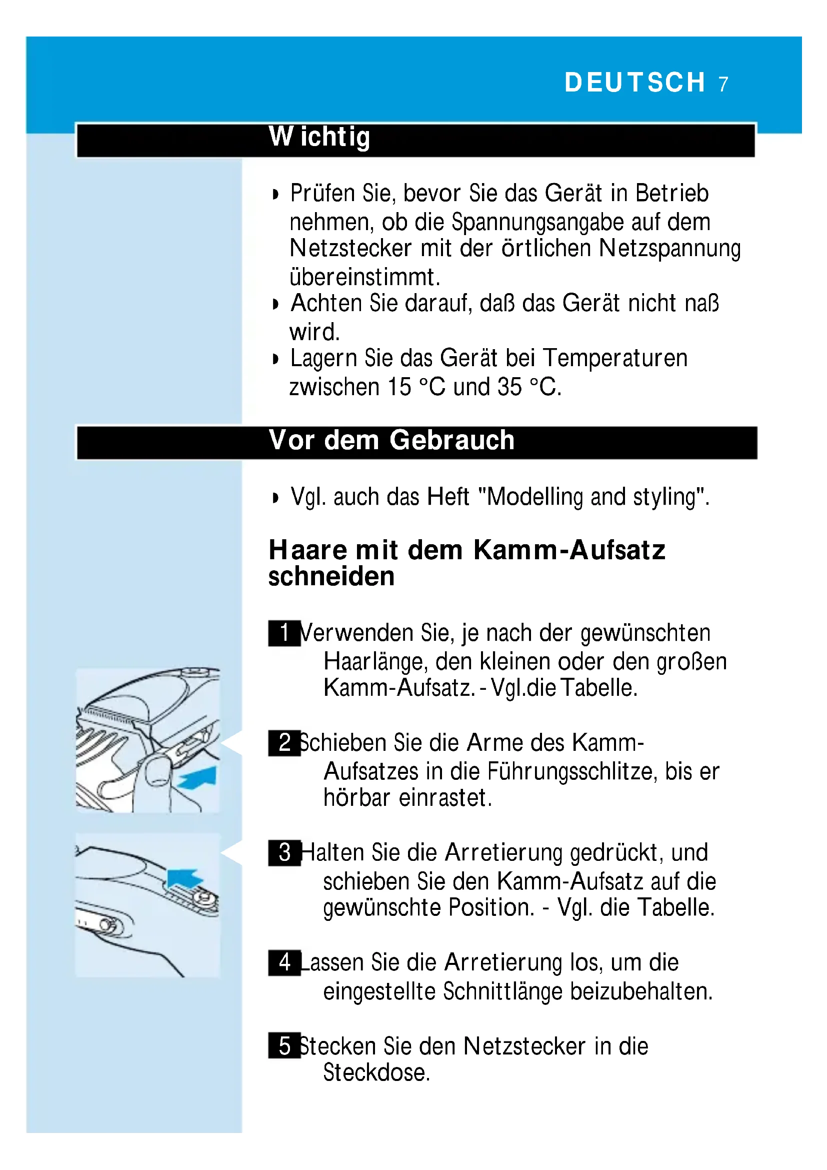 5 To reassemble the clipper, insert the hook of the cutting unit into the housing. 6 Push the cutting unit until you hear a click. Replacement A worn or damaged cutting unit should only be replaced with an original Philips cutting unit. If the mains cord of this appliance is damaged, it may only be replaced by Philips or an authorised Philips service centre, as special tools and/or parts are required. For telephone numbers of the Philips Helpdesk, see the Worldwide Guarantee leaflet. ENGLISH6Wichtig ◗ Prüfen Sie, bevor Sie das Gerät in Betrieb nehmen, ob die Spannungsangabe auf dem Netzstecker mit der örtlichen Netzspannung übereinstimmt. ◗ Achten Sie darauf, daß das Gerät nicht naß wird. ◗ Lagern Sie das Gerät bei Temperaturen zwischen 15 °C und 35 °C. Vor dem Gebrauch ◗ Vgl. auch das Heft "Modelling and styling". Haare mit dem Kamm-Aufsatz schneiden 1 Verwenden Sie, je nach der gewünschten Haarlänge, den kleinen oder den großen Kamm-Aufsatz. - Vgl.die Tabelle.