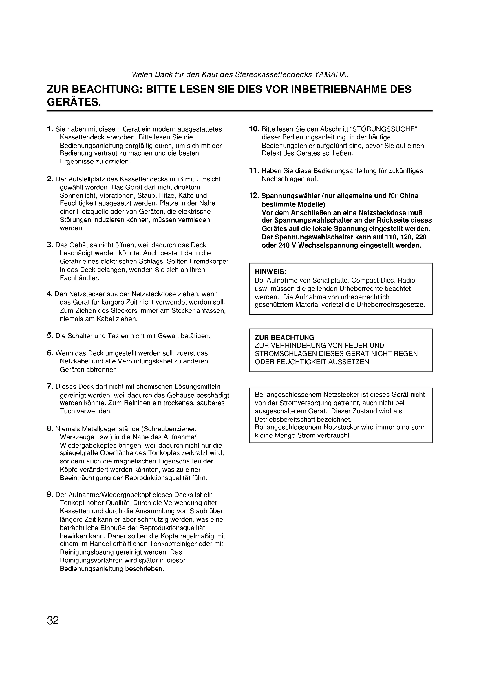 - YAMAHA empfiehlt nicht die Verwendung von Kassetten mit 120 Minuten Bandlänge, da das Band dieser Kassetten sehr dünn ist und zu mechanischen und Aufnahme-Problemen führen kann.